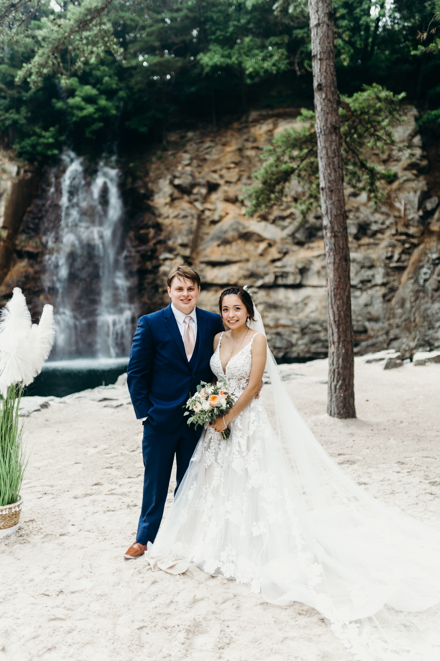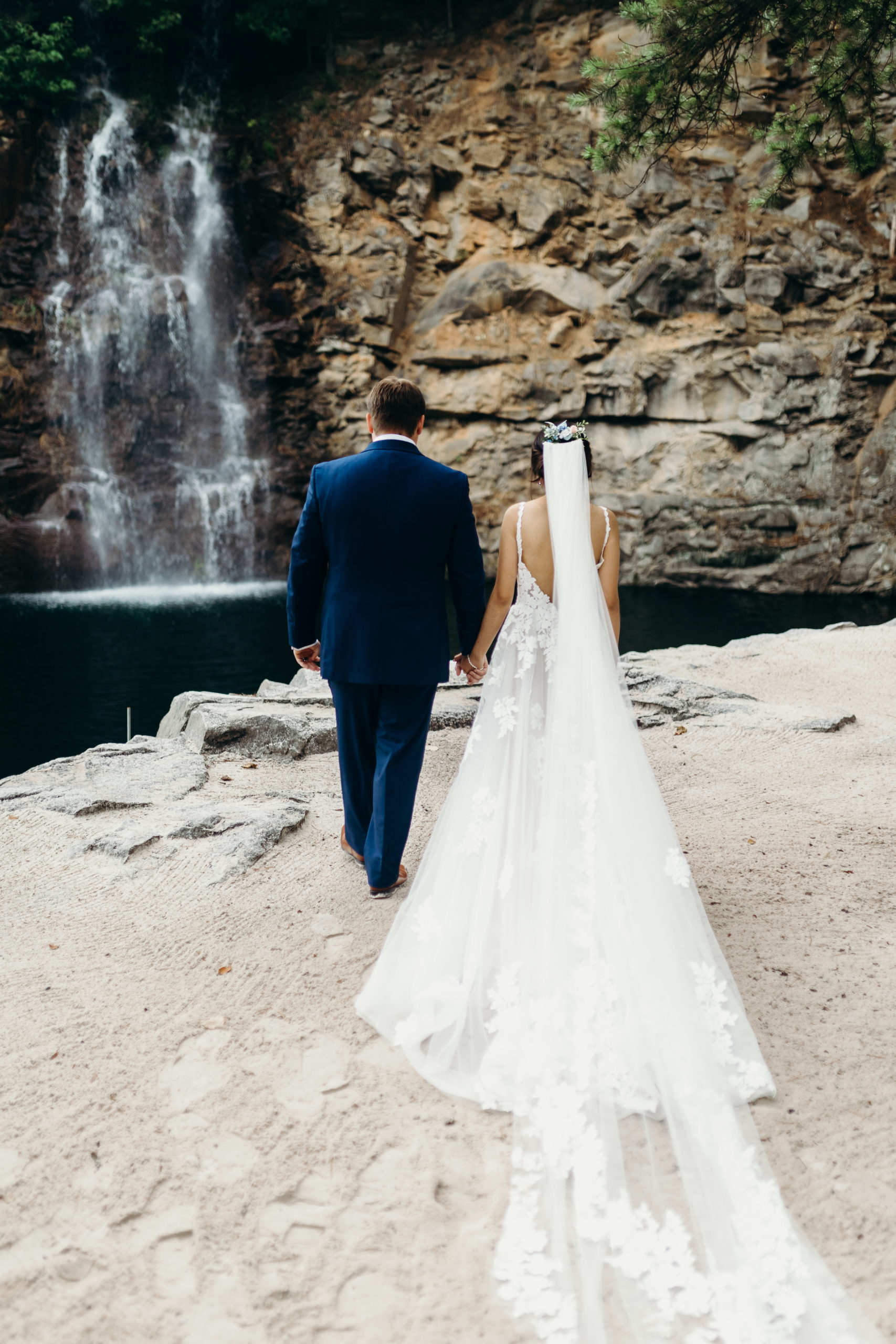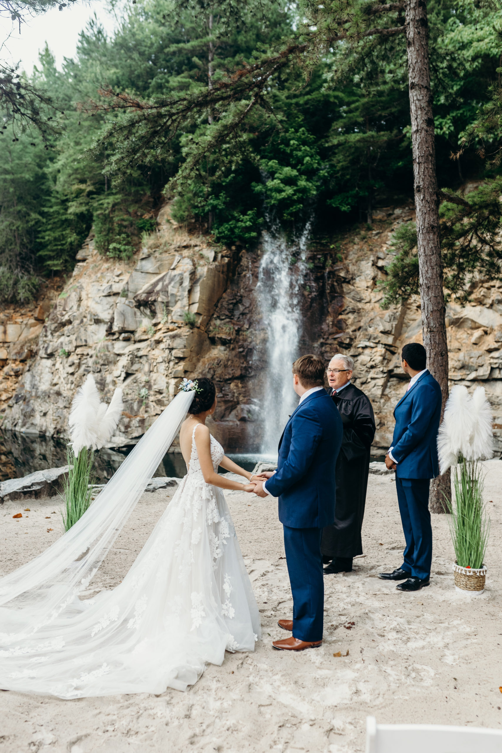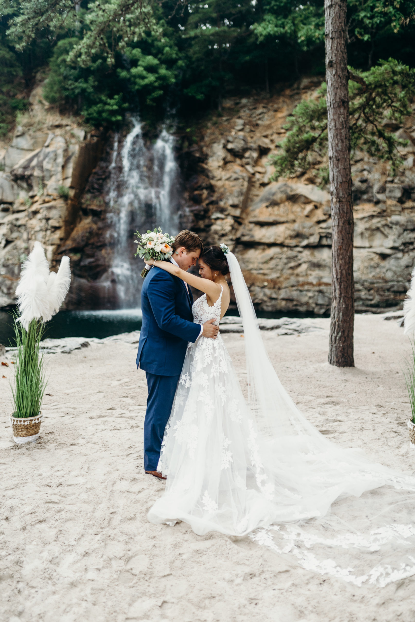 Preceding her was family dogs and mom, followed by her arm in arm with her father! It was absolutely perfect. Her dress was the most beautiful lace with a gorgeous train, perfect for her bohemian glam look. Their ceremony location was at so pretty nestled in the trees with the rock quarry & waterfall in the background, that made its appearance as soon as they were announced Husband & Wife. It was such an incredible day & I am so excited to share the photos with you.