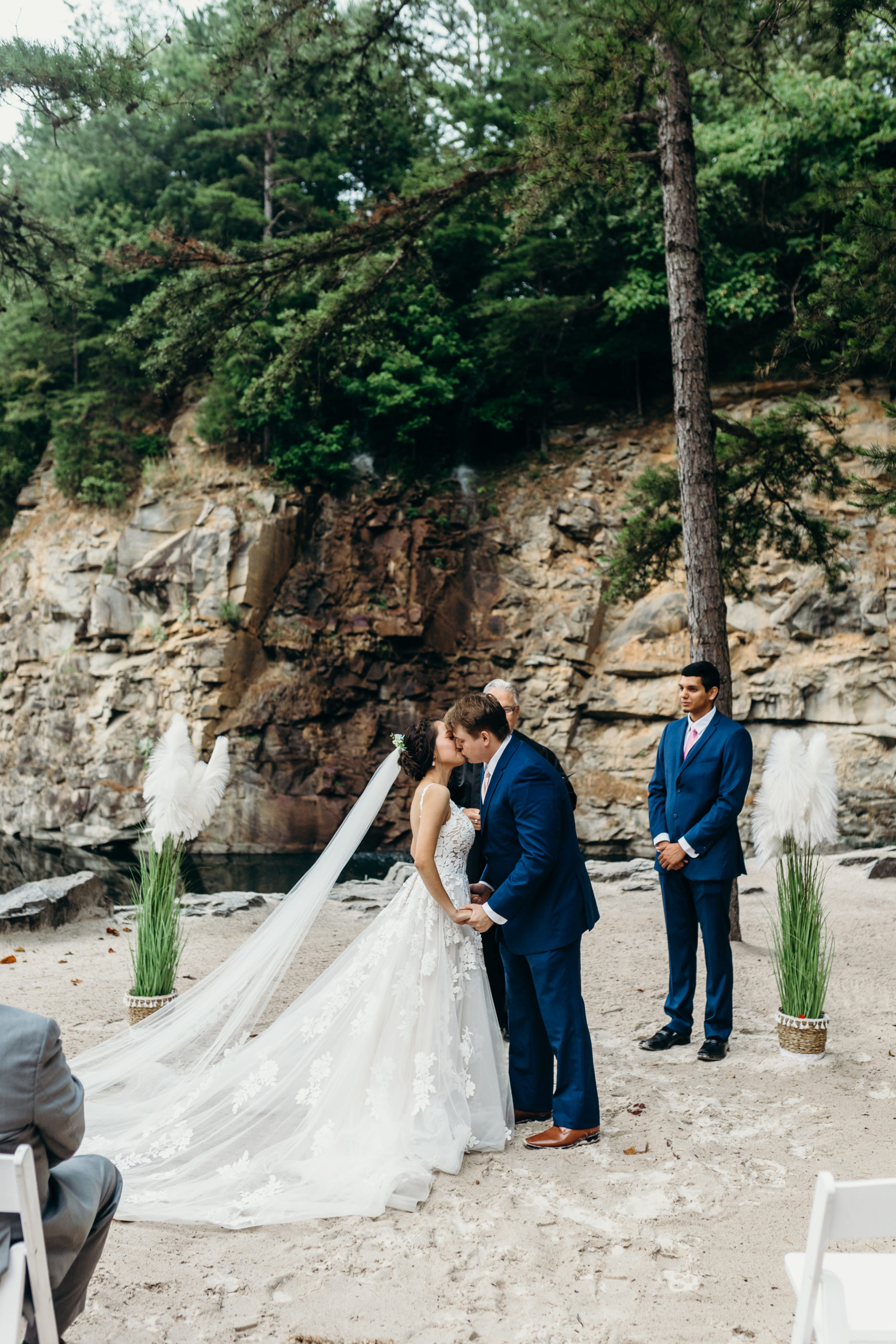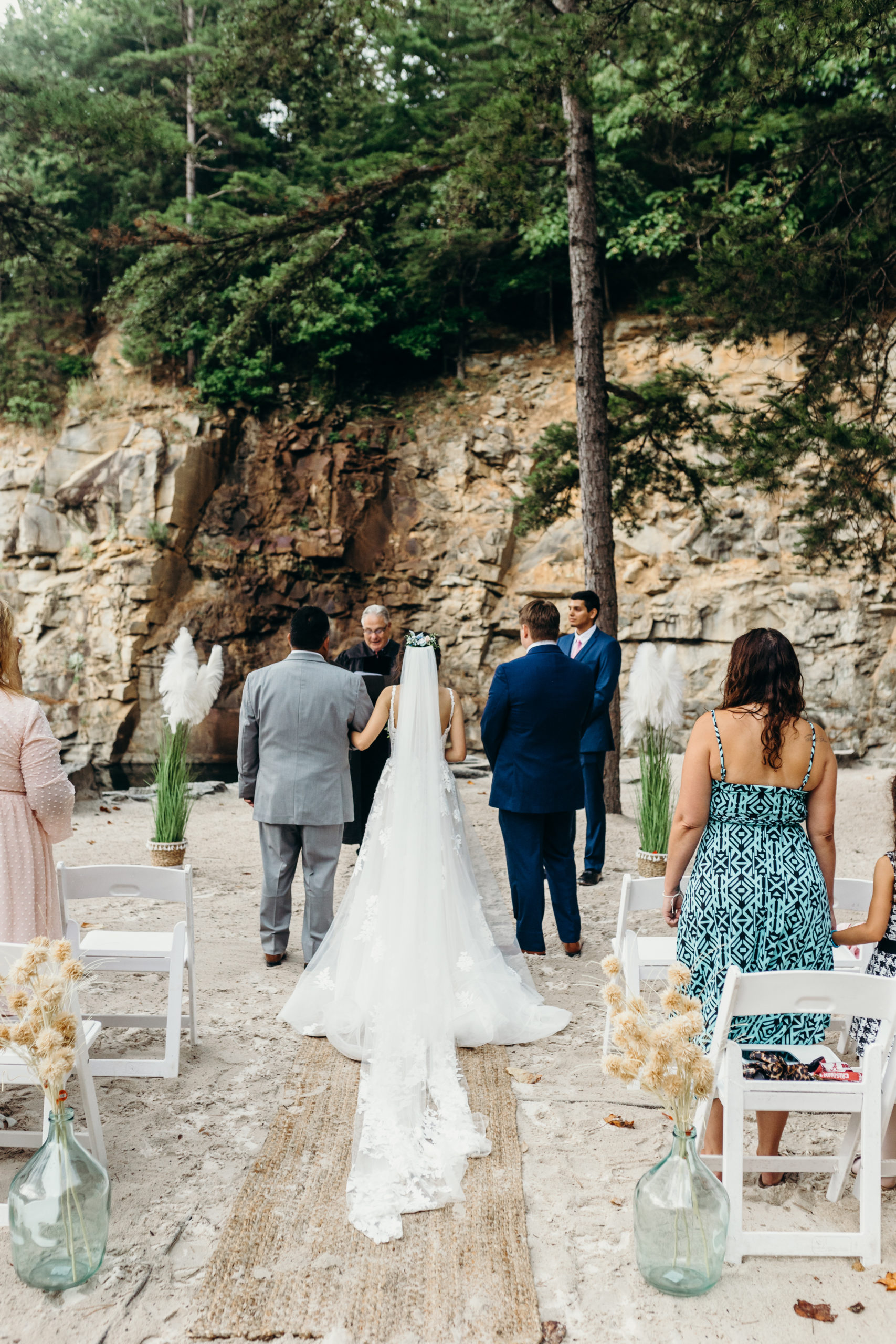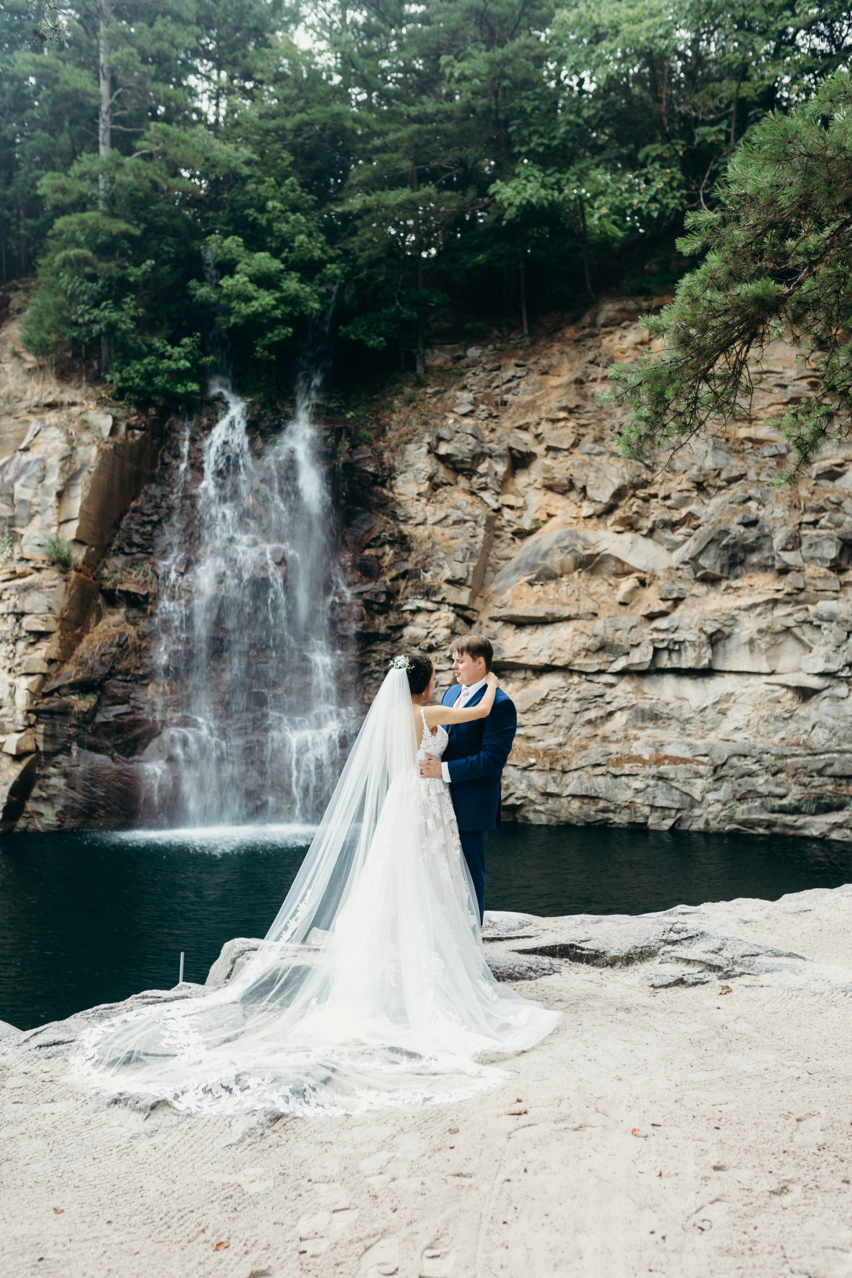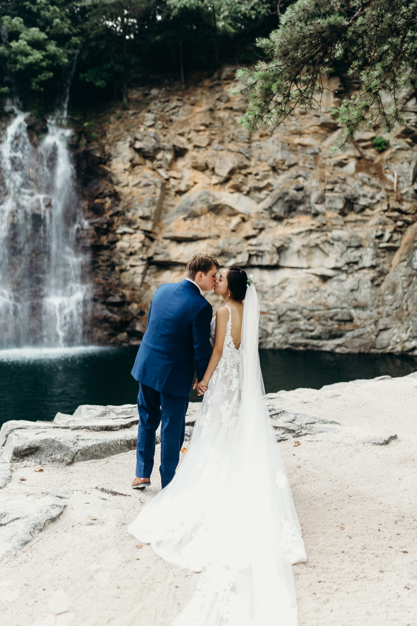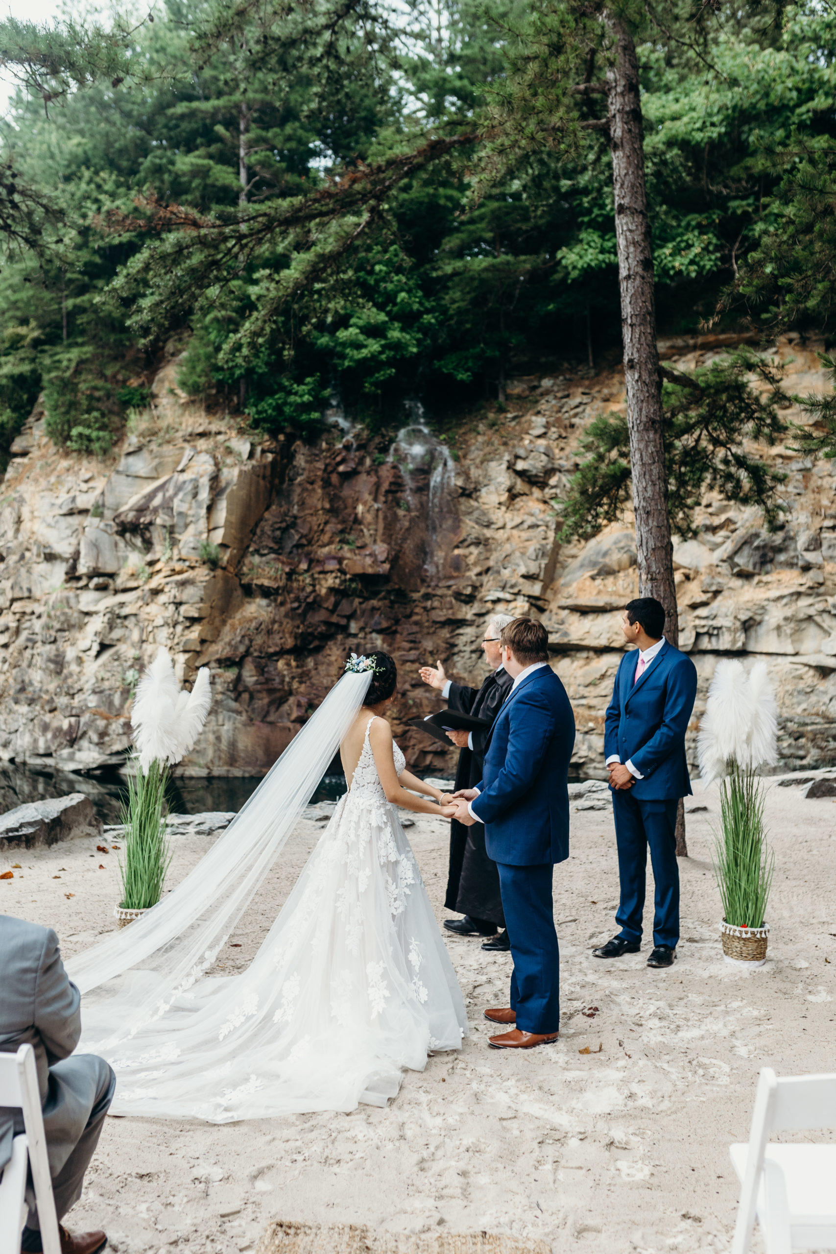 Preceding her was family dogs and mom, followed by her arm in arm with her father! It was absolutely perfect. Her dress was the most beautiful lace with a gorgeous train, perfect for her bohemian glam look. Their ceremony location was at so pretty nestled in the trees with the rock quarry & waterfall in the background, that made its appearance as soon as they were announced Husband & Wife. It was such an incredible day & I am so excited to share the photos with you.