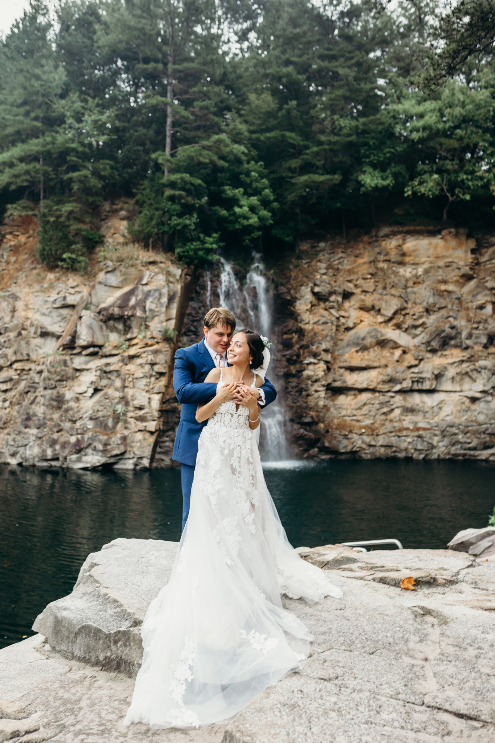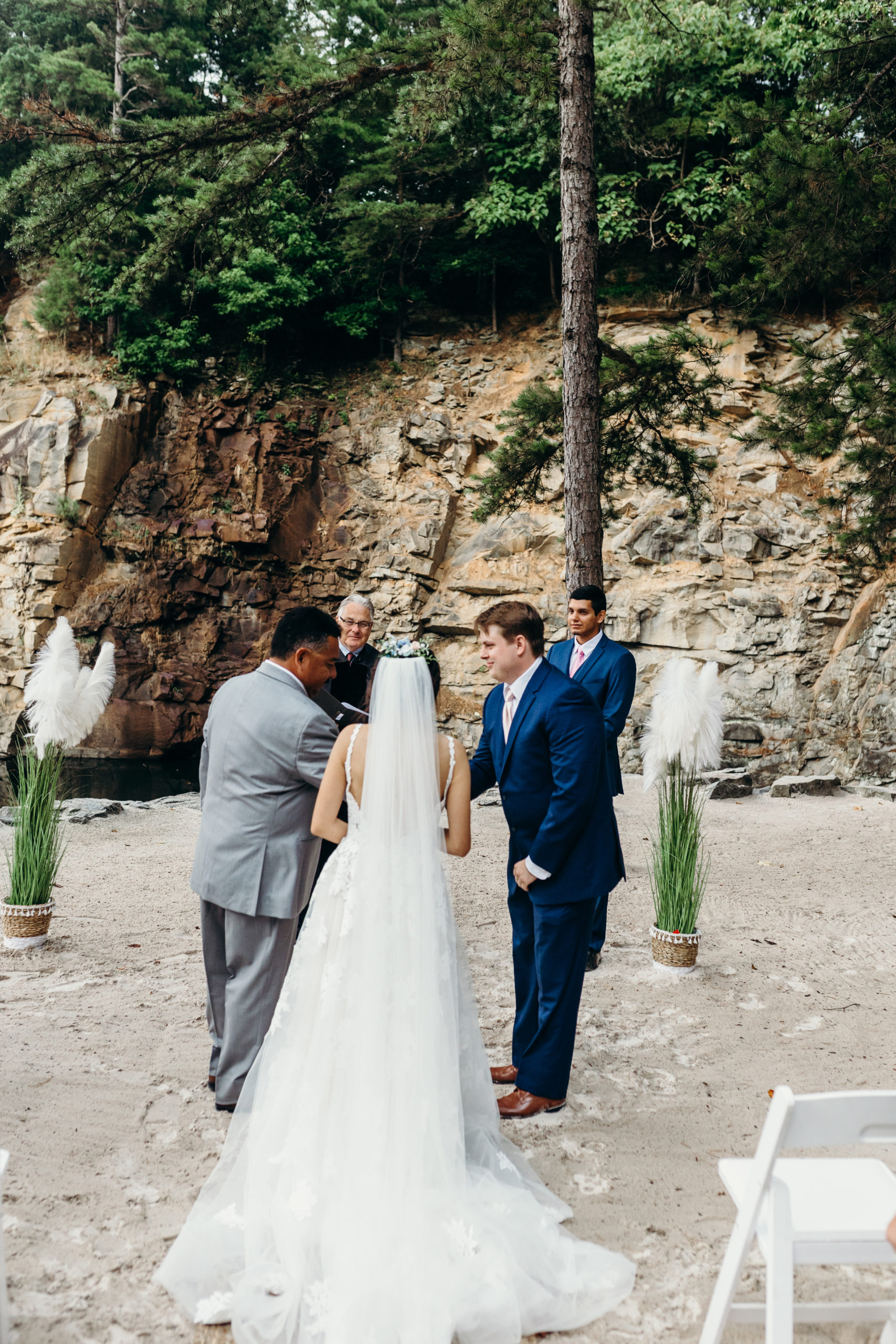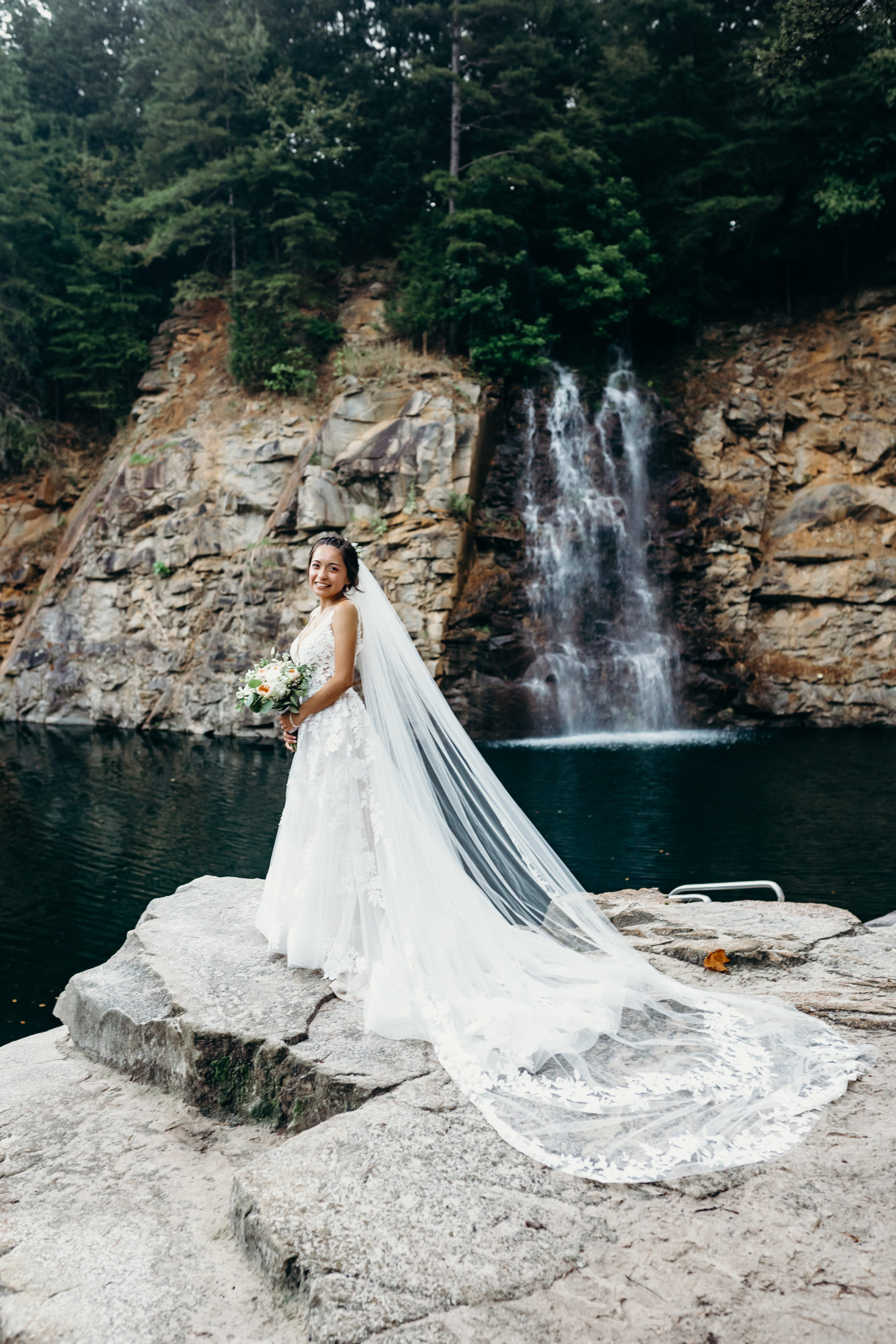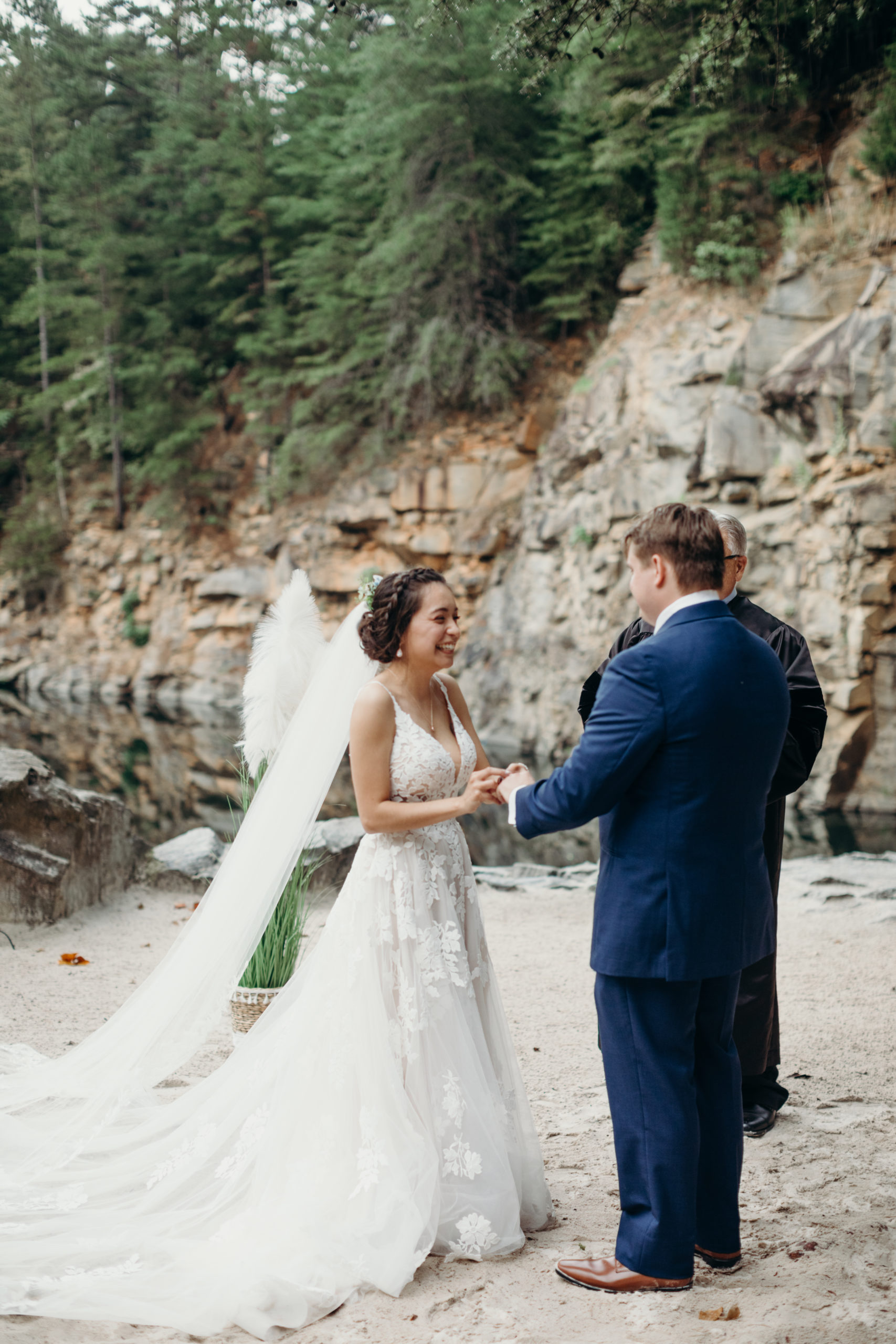 Preceding her was family dogs and mom, followed by her arm in arm with her father! It was absolutely perfect. Her dress was the most beautiful lace with a gorgeous train, perfect for her bohemian glam look. Their ceremony location was at so pretty nestled in the trees with the rock quarry & waterfall in the background, that made its appearance as soon as they were announced Husband & Wife. It was such an incredible day & I am so excited to share the photos with you.