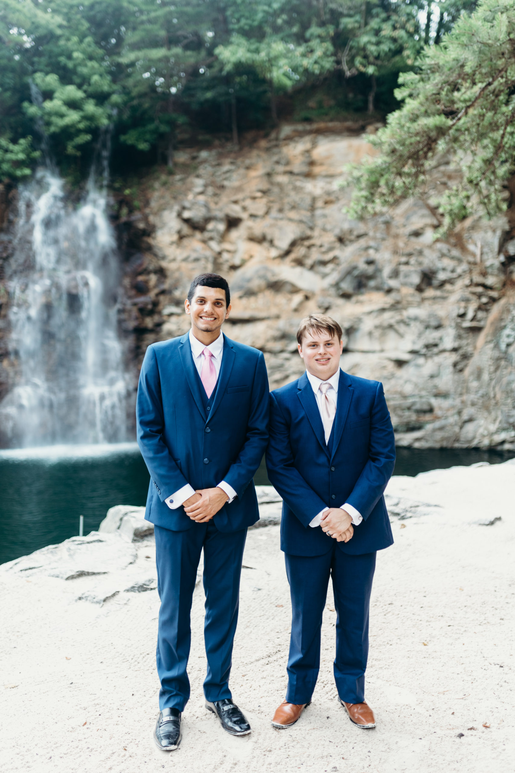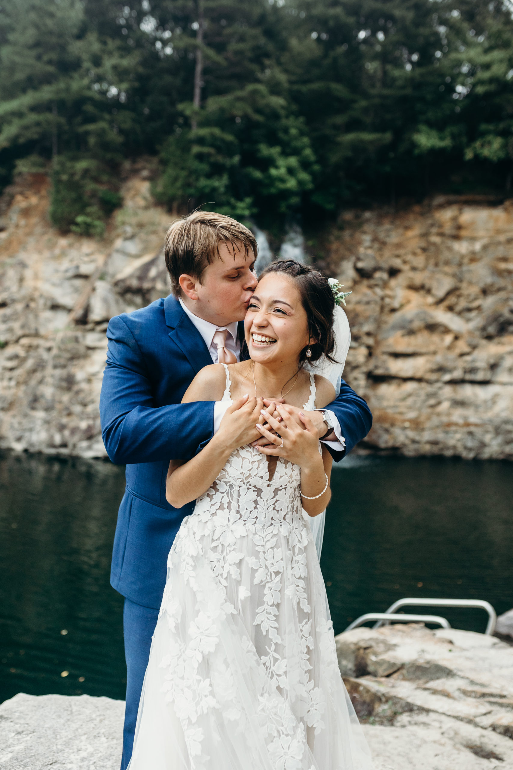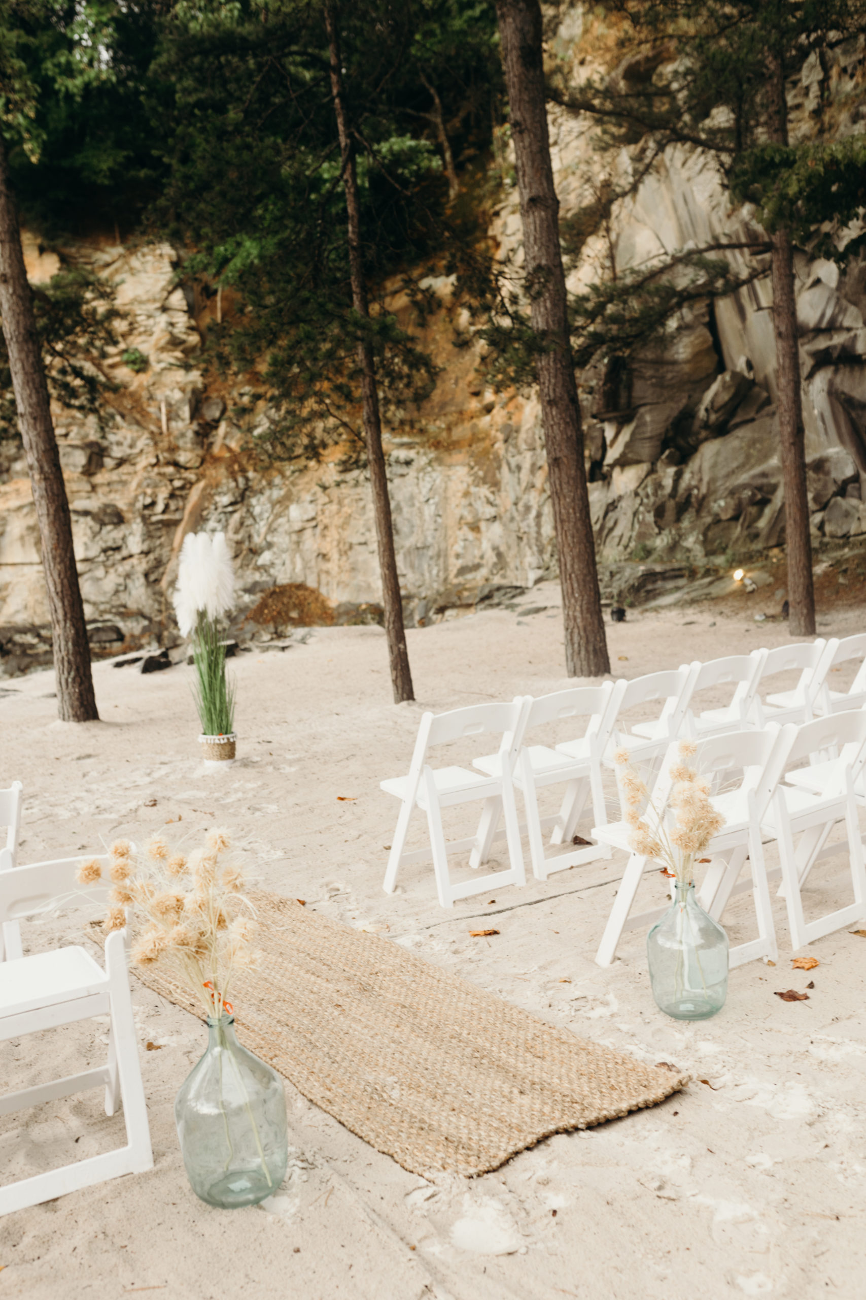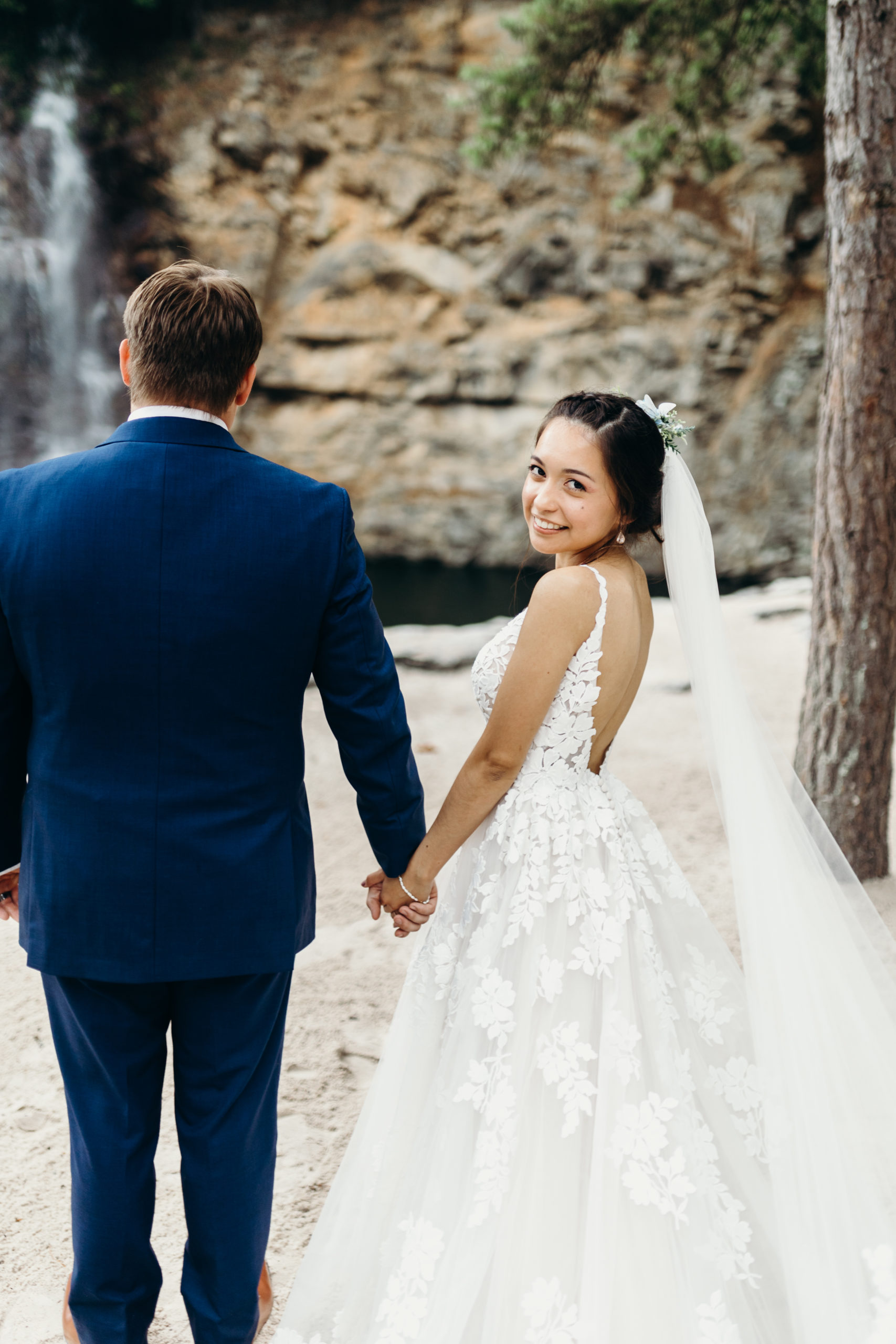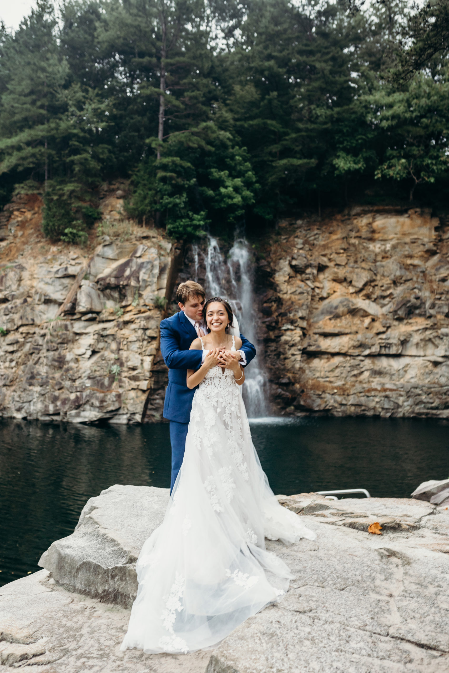 Preceding her was family dogs and mom, followed by her arm in arm with her father! It was absolutely perfect. Her dress was the most beautiful lace with a gorgeous train, perfect for her bohemian glam look. Their ceremony location was at so pretty nestled in the trees with the rock quarry & waterfall in the background, that made its appearance as soon as they were announced Husband & Wife. It was such an incredible day & I am so excited to share the photos with you.