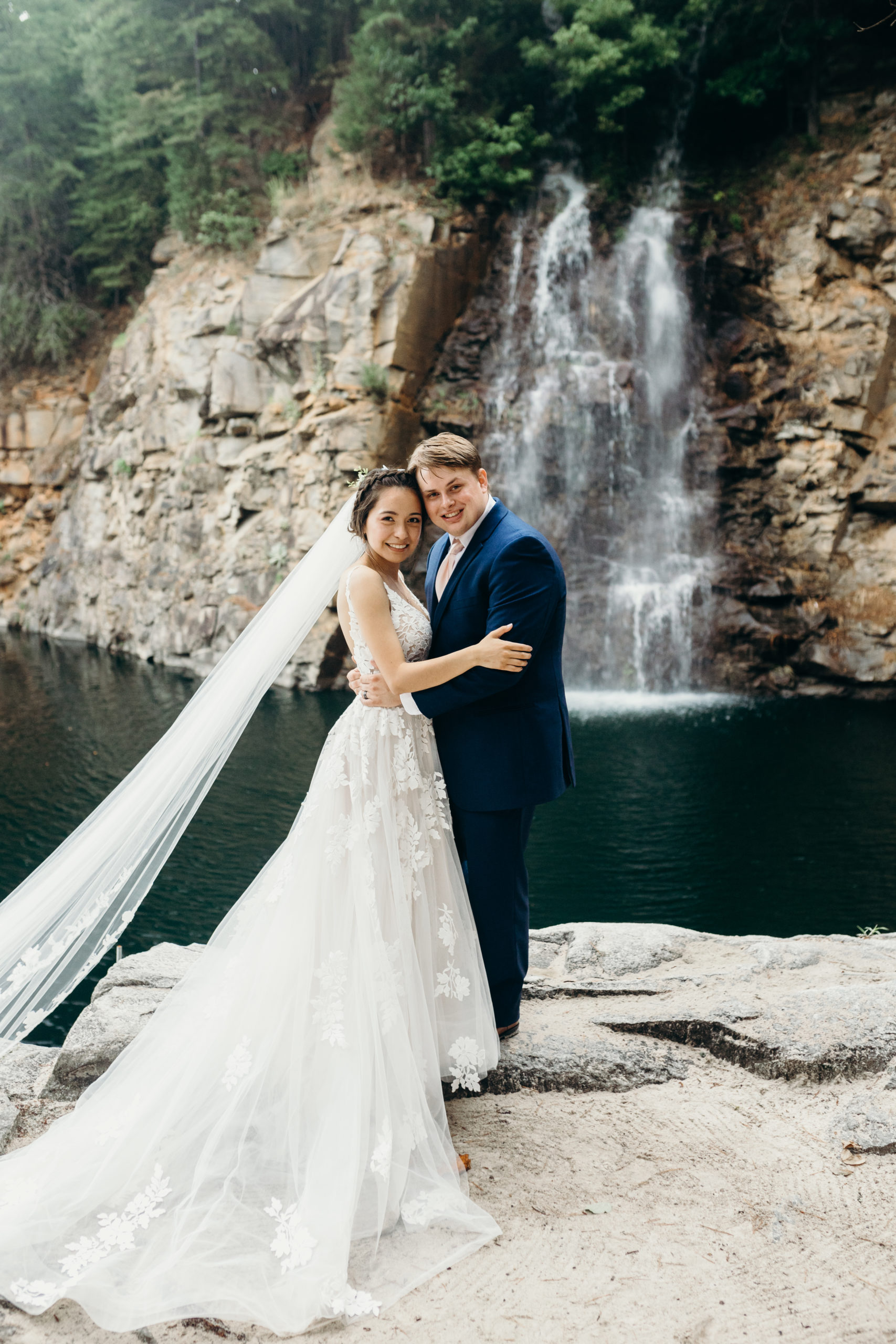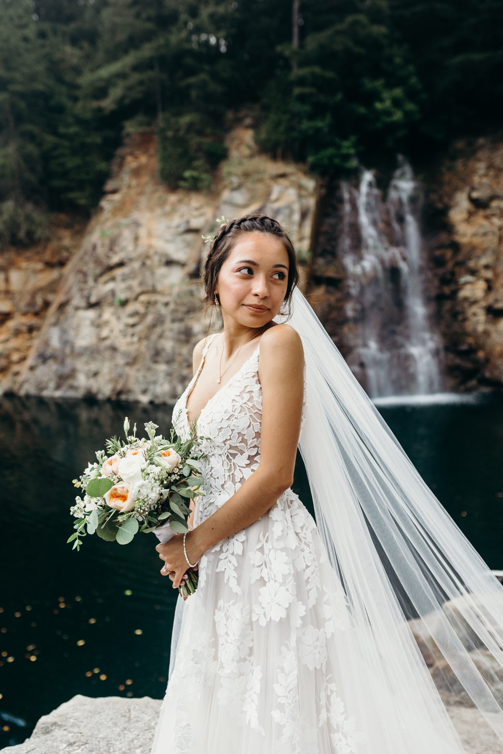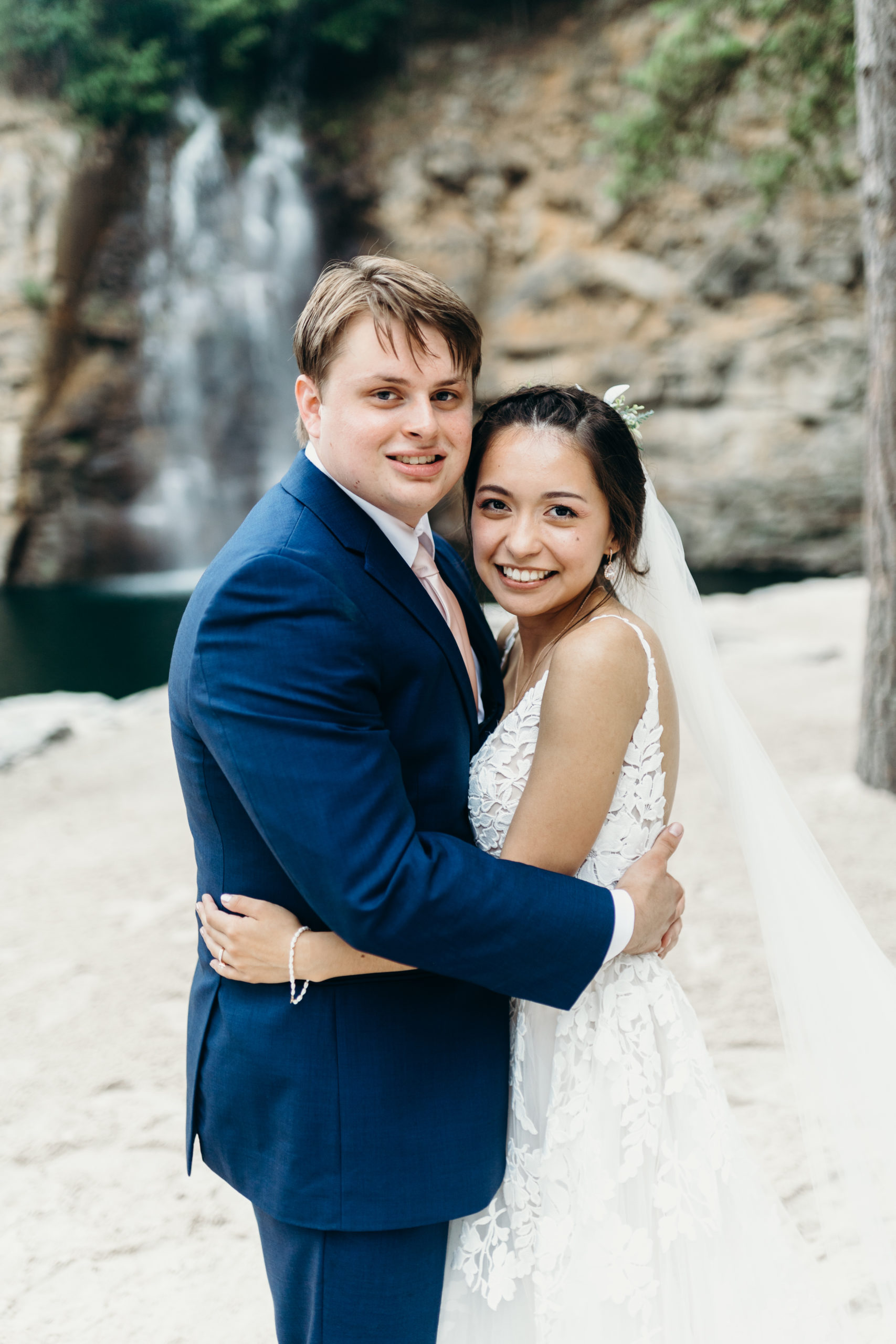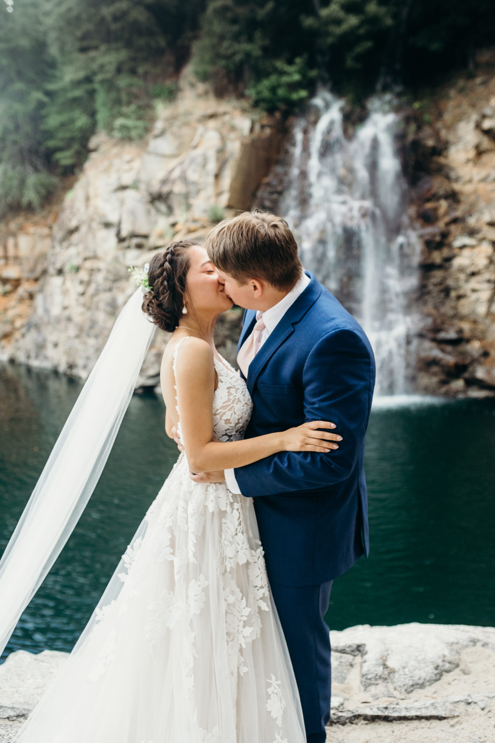 Preceding her was family dogs and mom, followed by her arm in arm with her father! It was absolutely perfect. Her dress was the most beautiful lace with a gorgeous train, perfect for her bohemian glam look. Their ceremony location was at so pretty nestled in the trees with the rock quarry & waterfall in the background, that made its appearance as soon as they were announced Husband & Wife. It was such an incredible day & I am so excited to share the photos with you.