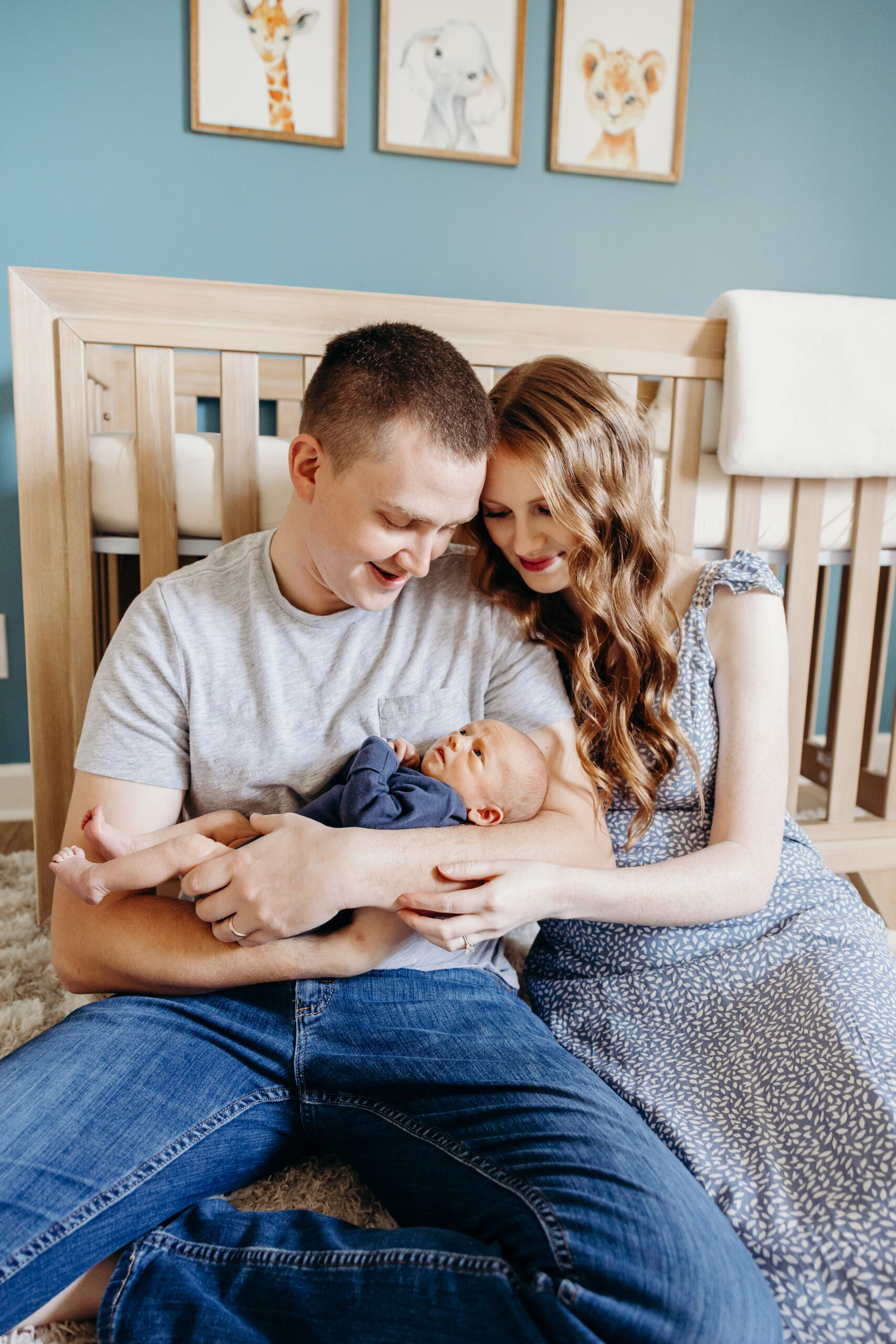 Kaden and Kinsley’s love for their little one radiated through every image. The way they looked at their baby, held him close, and soaked in every tiny detail was simply beautiful. The nursery’s soft blue accent wall, framed watercolor animal prints, and cozy textures created such a warm and peaceful setting—ideal for these first family portraits.