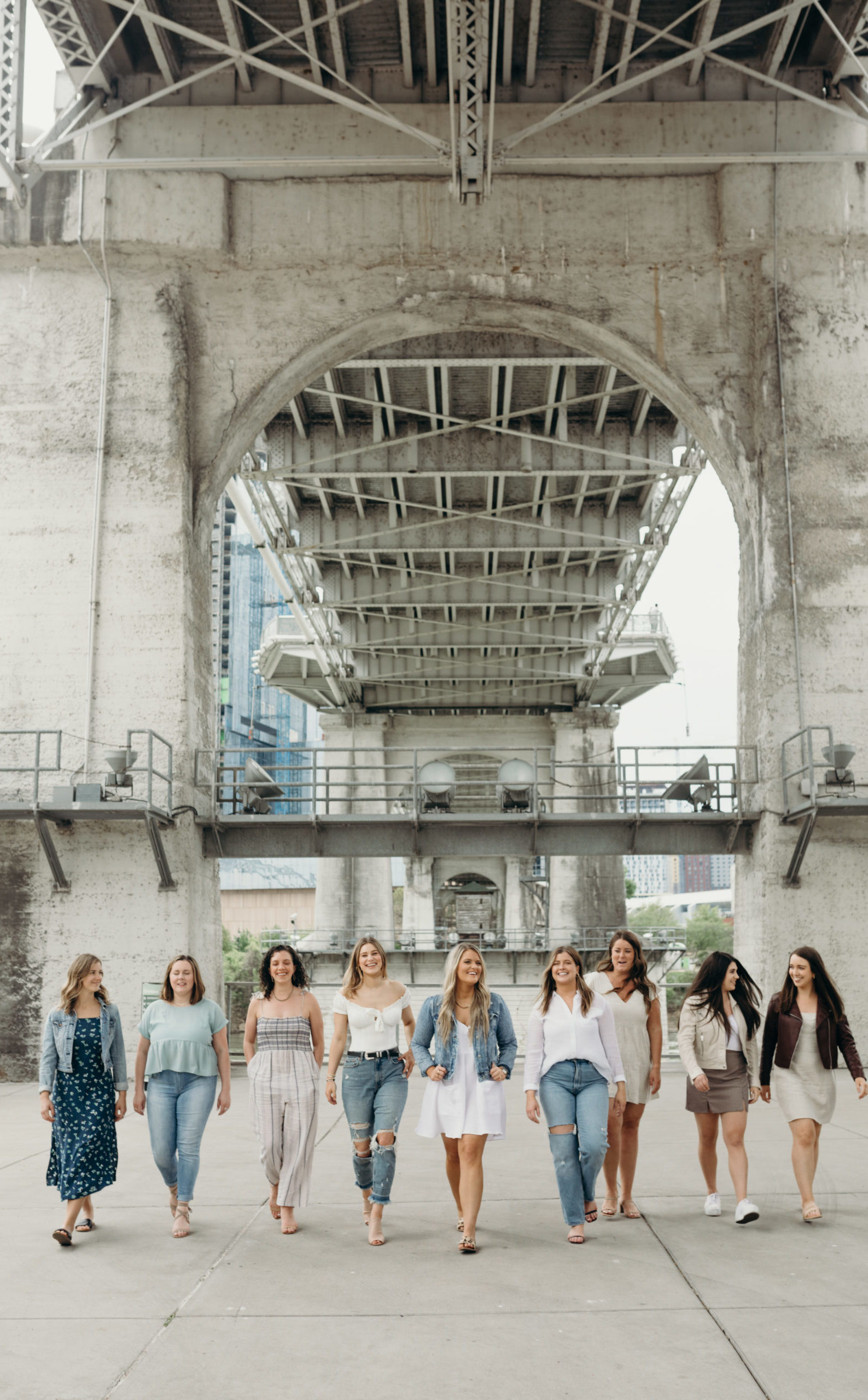 I met Emily, Lauren, Haley, Anna, Madeline, Sally, Catherine, Alex & Lindsay on the Pedestrian Bridge after they enjoyed brunch at the lovely Hampton Social. We were the center of attention on the bridge during their shoot, but it was so much fun having all of the eyes on sweet Emily. We made our way below the bridge & then ended their session popping a little champagne to celebrate. Emily is so loved by these girls & it was so wonderful getting to document this trip for them!