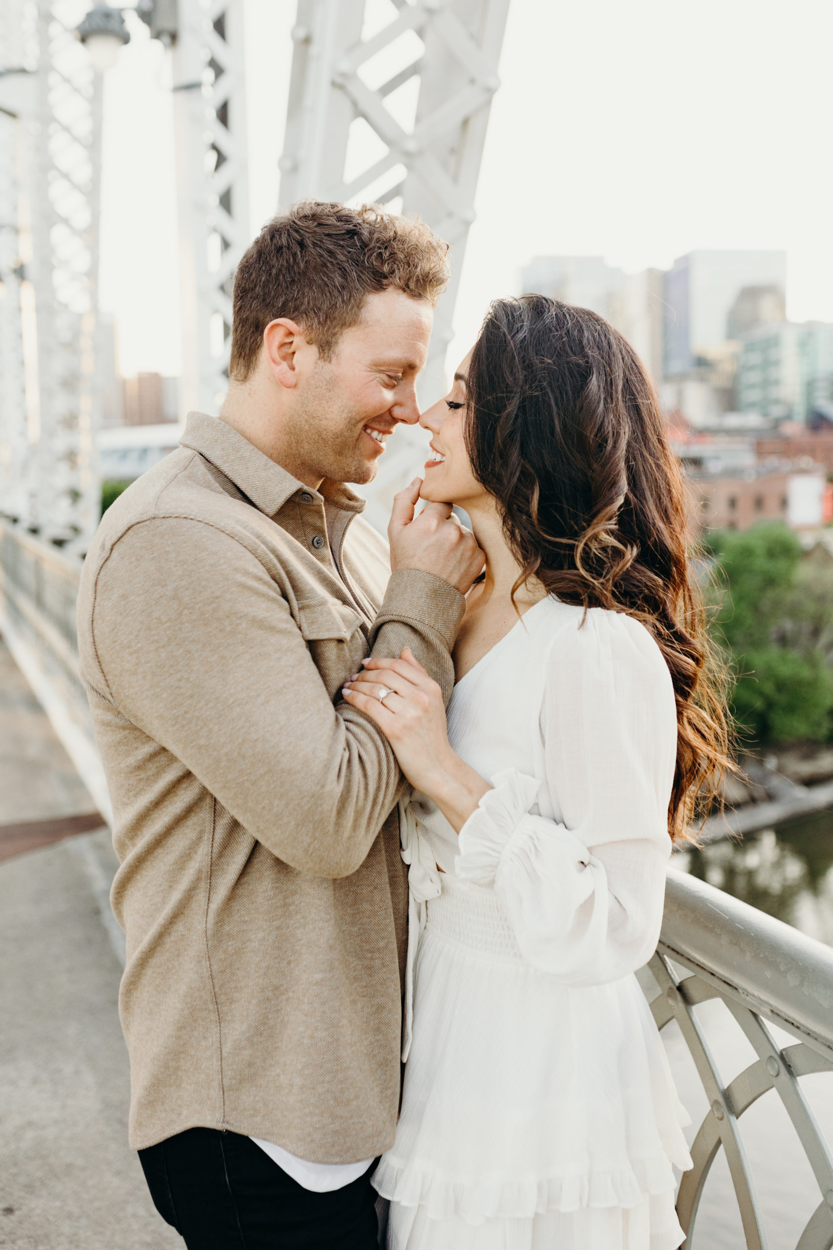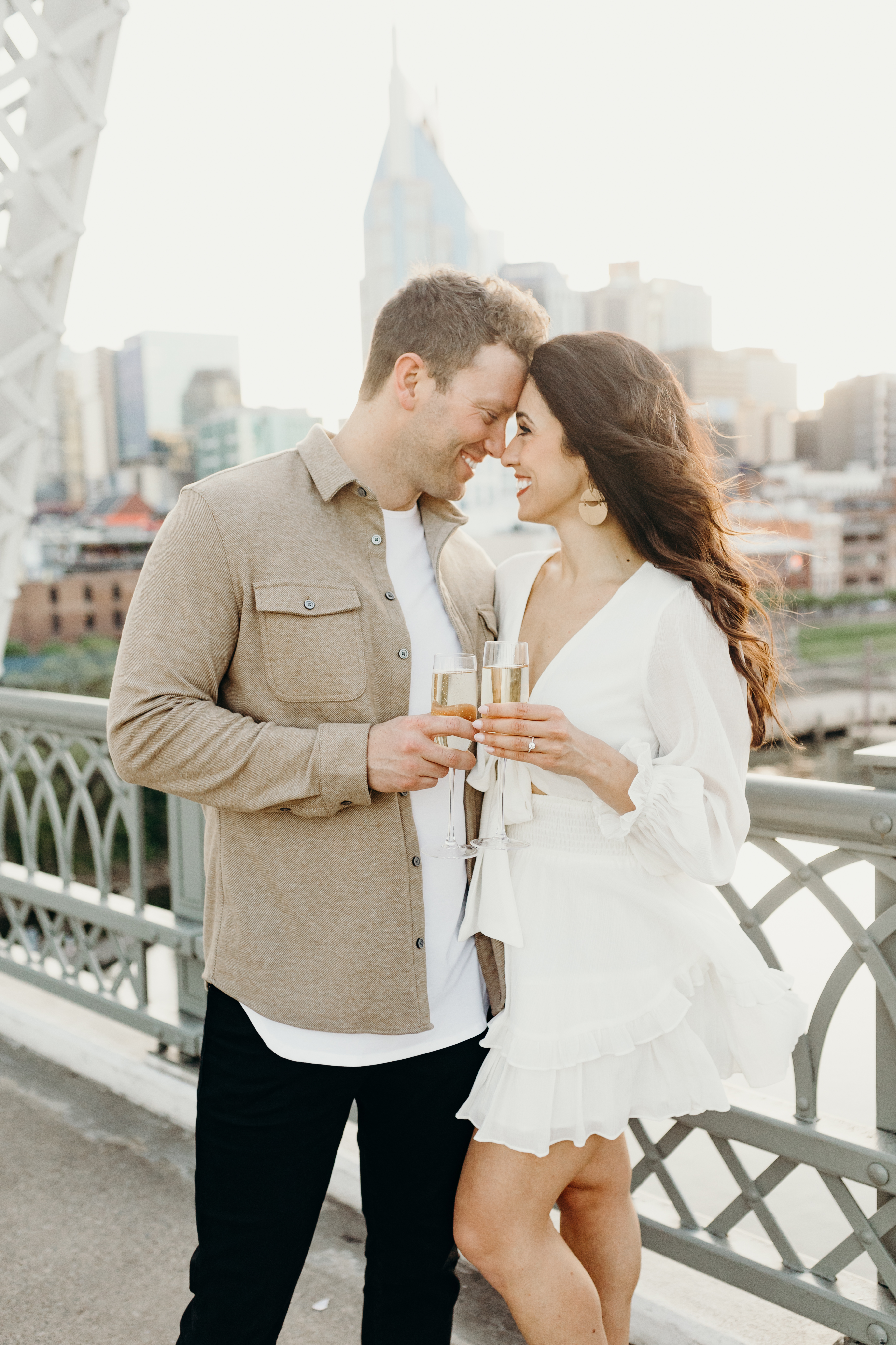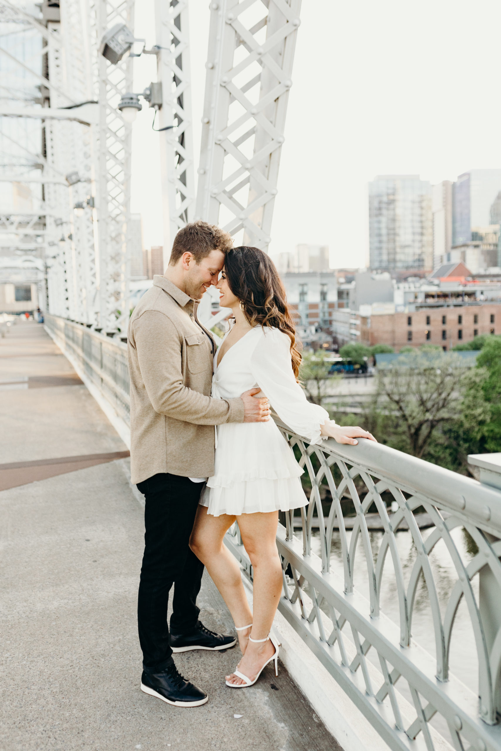 I have been so excited to share these Nashville Skyline Engagement photos with you. These two knocked it out of the park & it was so much fun photographing them. I met I’m at Kaleb and Ayda at the pedestrian Bridge on the most beautiful Sunday evening. We had to reschedule because of the Garth Brooks concert the week before, but it worked out perfectly because we got the most beautiful sunset. Kaleb & Ayda are from the Indianapolis area and will get be getting married there this fall. This was the perfect opportunity for them to do their engagement session in their new city. They’ve been here for a little over a year and I are loving Nashville. We started at the pedestrian bridge walked to Broadway and then made our way back and popped a little champagne on the bridge. It will be so fun getting to know these two over the years as they grow their relationship! The Nashville skyline never disappoints and I am so excited to share these photos with you!