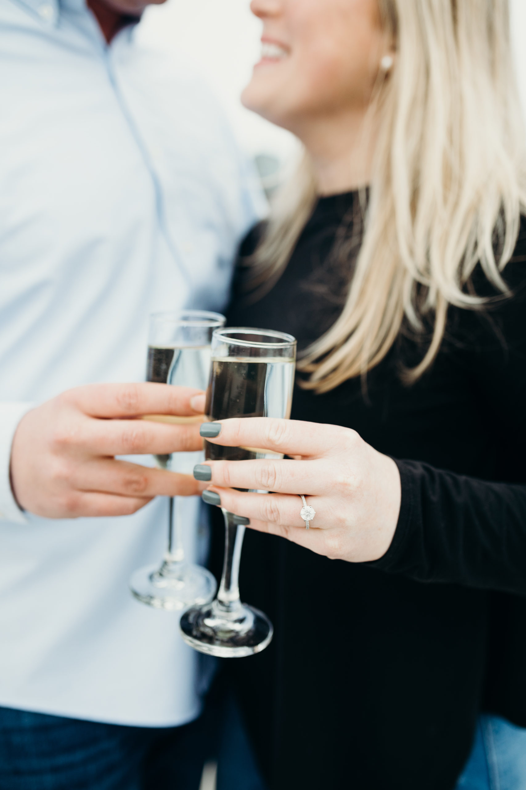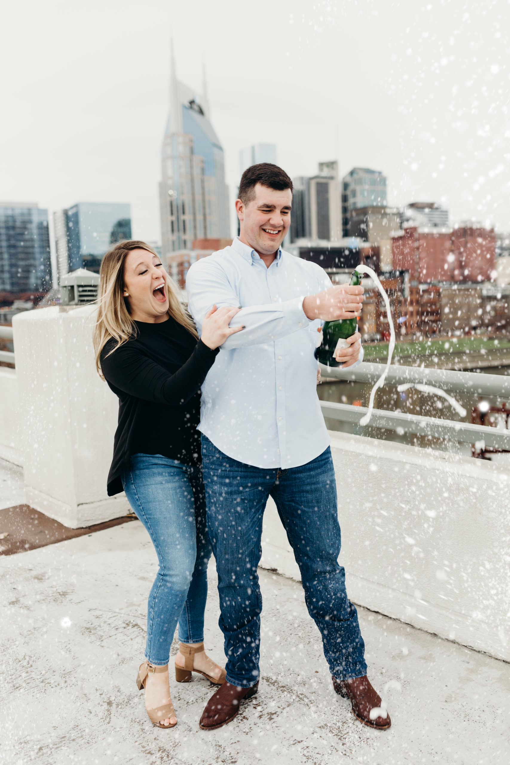 We started their Engagement session under the Nashville Pedestrian Bridge. Due to the rain in the forecast. Angus & Shelby brought their two fur babies along & we all know I LOVE a good family photo with your fur best friends! We had so much fun during their shoot. And ended with popping a little champagne on the bridge with the Nashville Skyline in the background. Although we didn’t get much sun, it was so pretty & we laughed a ton during their session. Love these two & cannot wait for their big day!