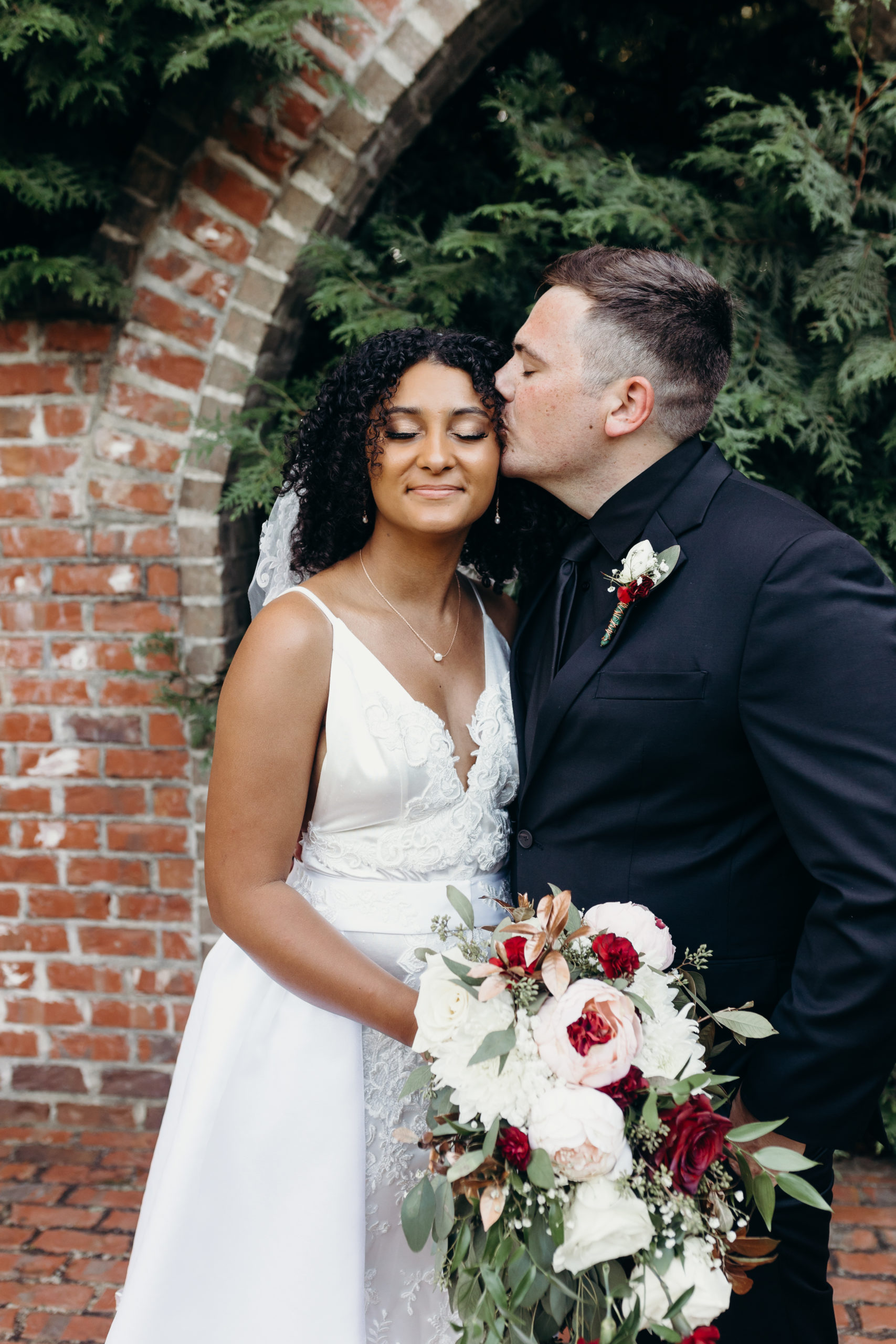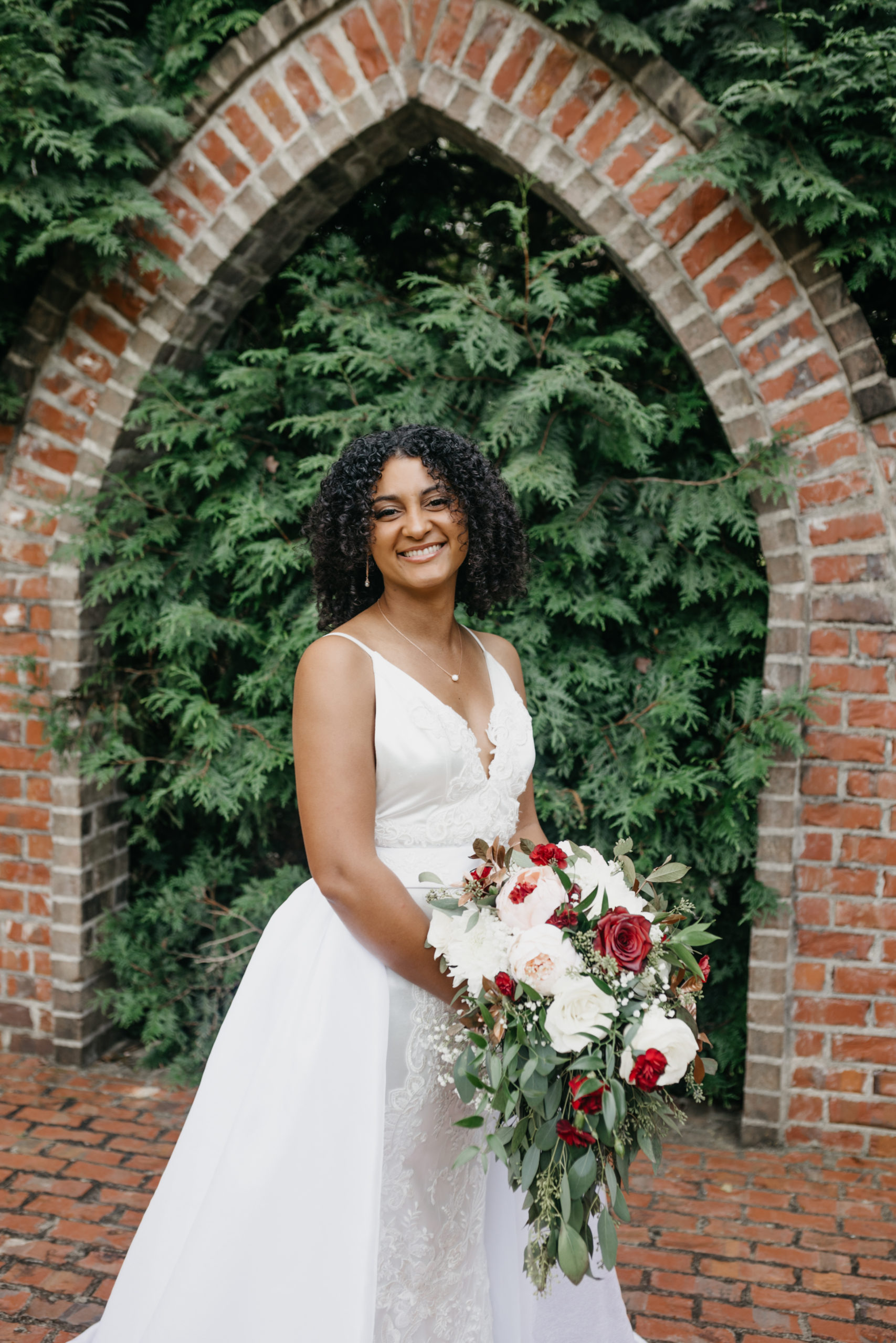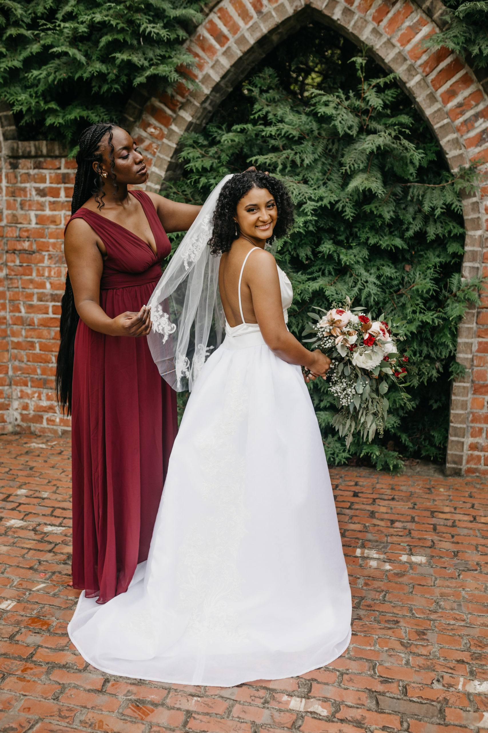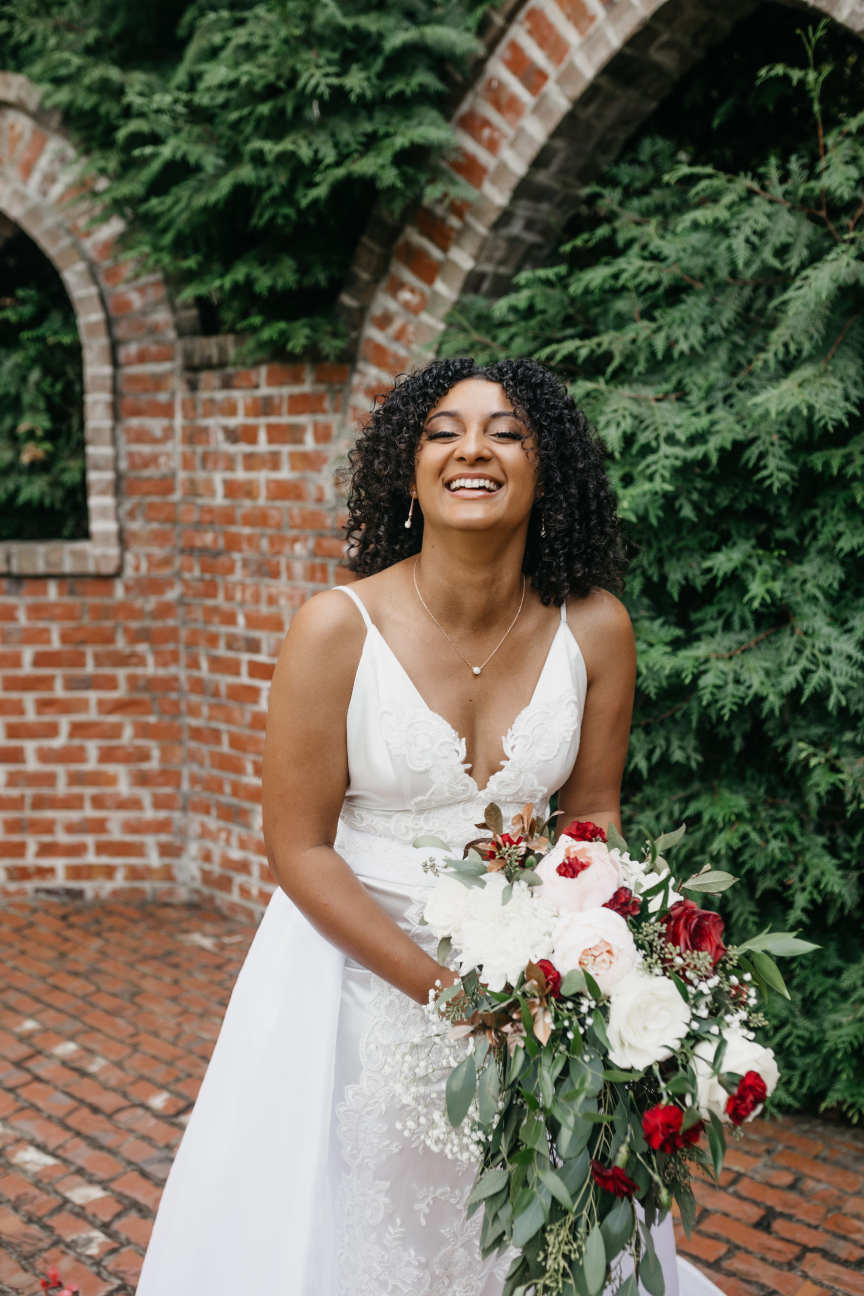 Joey & Raven chose the most beautiful fall color palette with rich Burgundy & pops of pink in the florals. This evoked such elegance that looked perfectly intentional yet totally effortless. The organic floral design was one of the highlights of the day, featuring lots of lush greenery. Altogether, the details were visually captivating. But none as much as Ravens’s stunning dress, made by her grandmother!