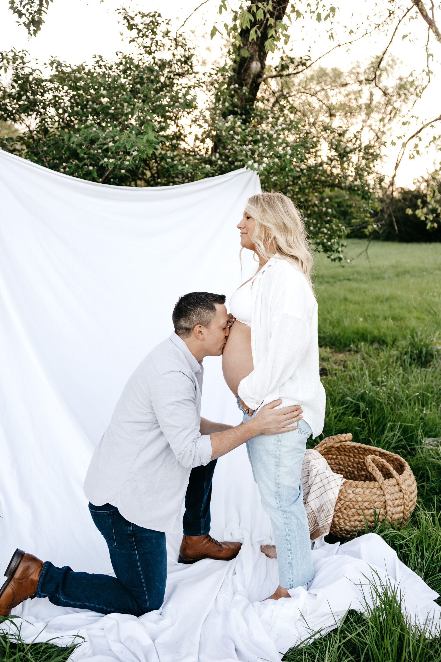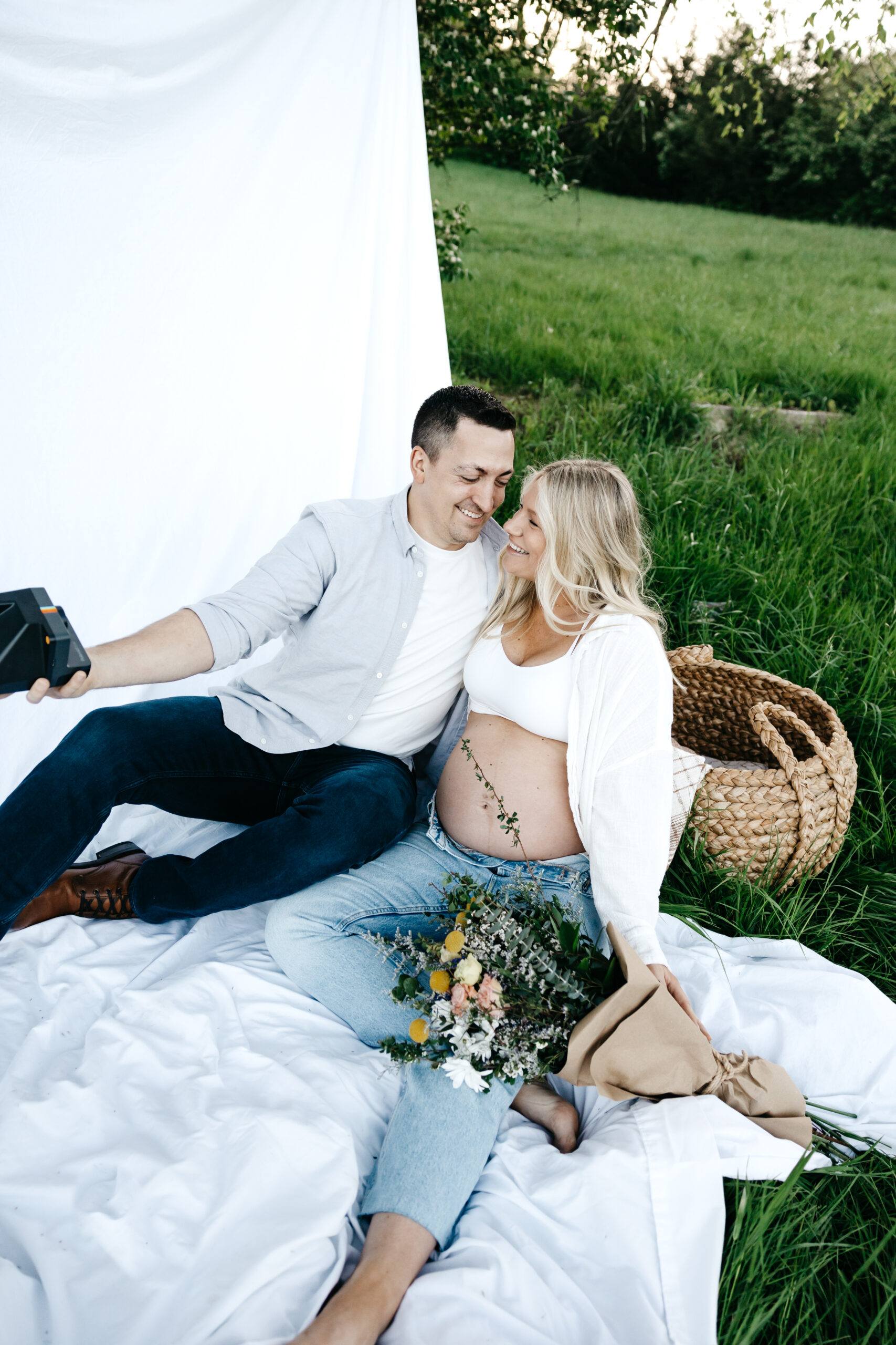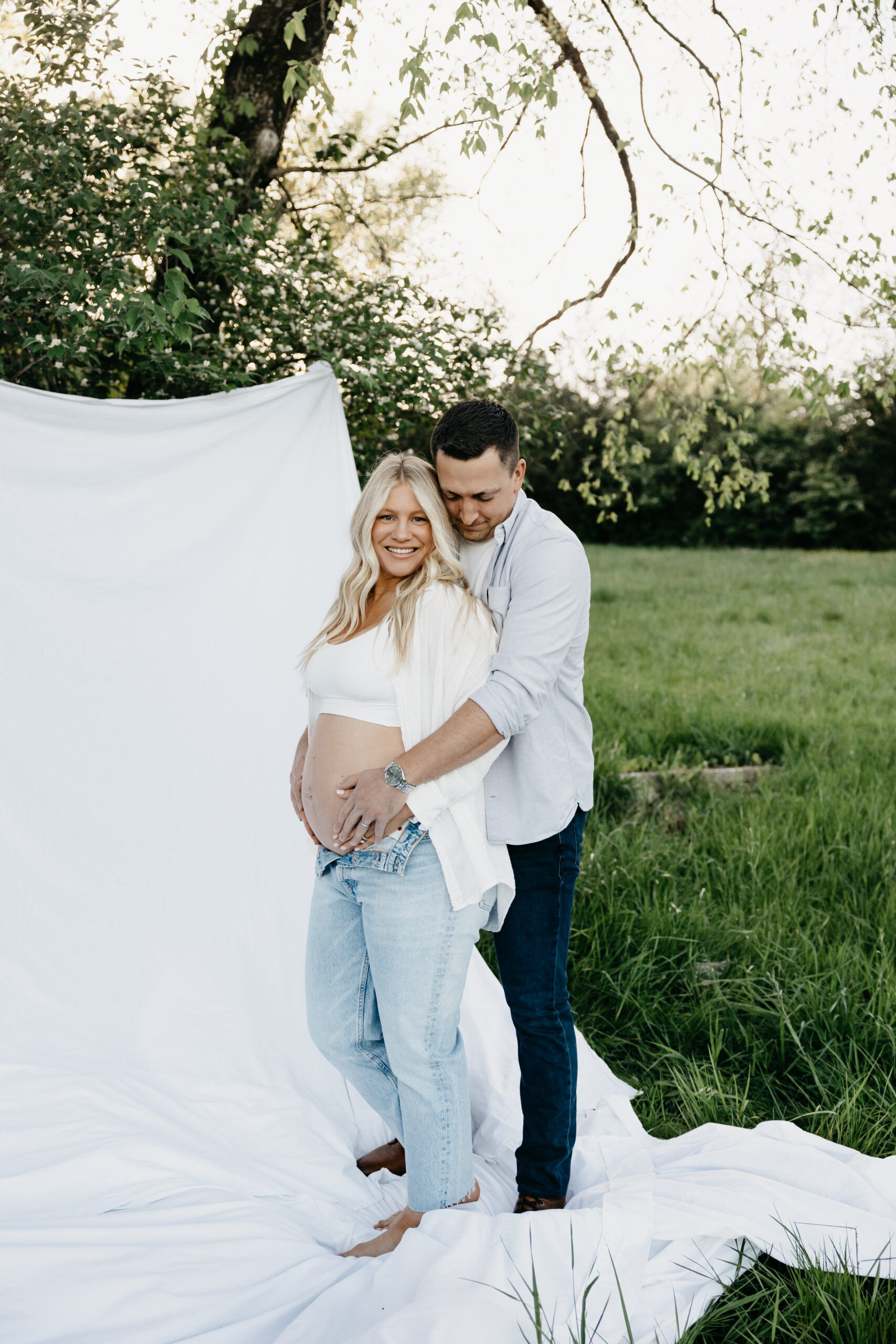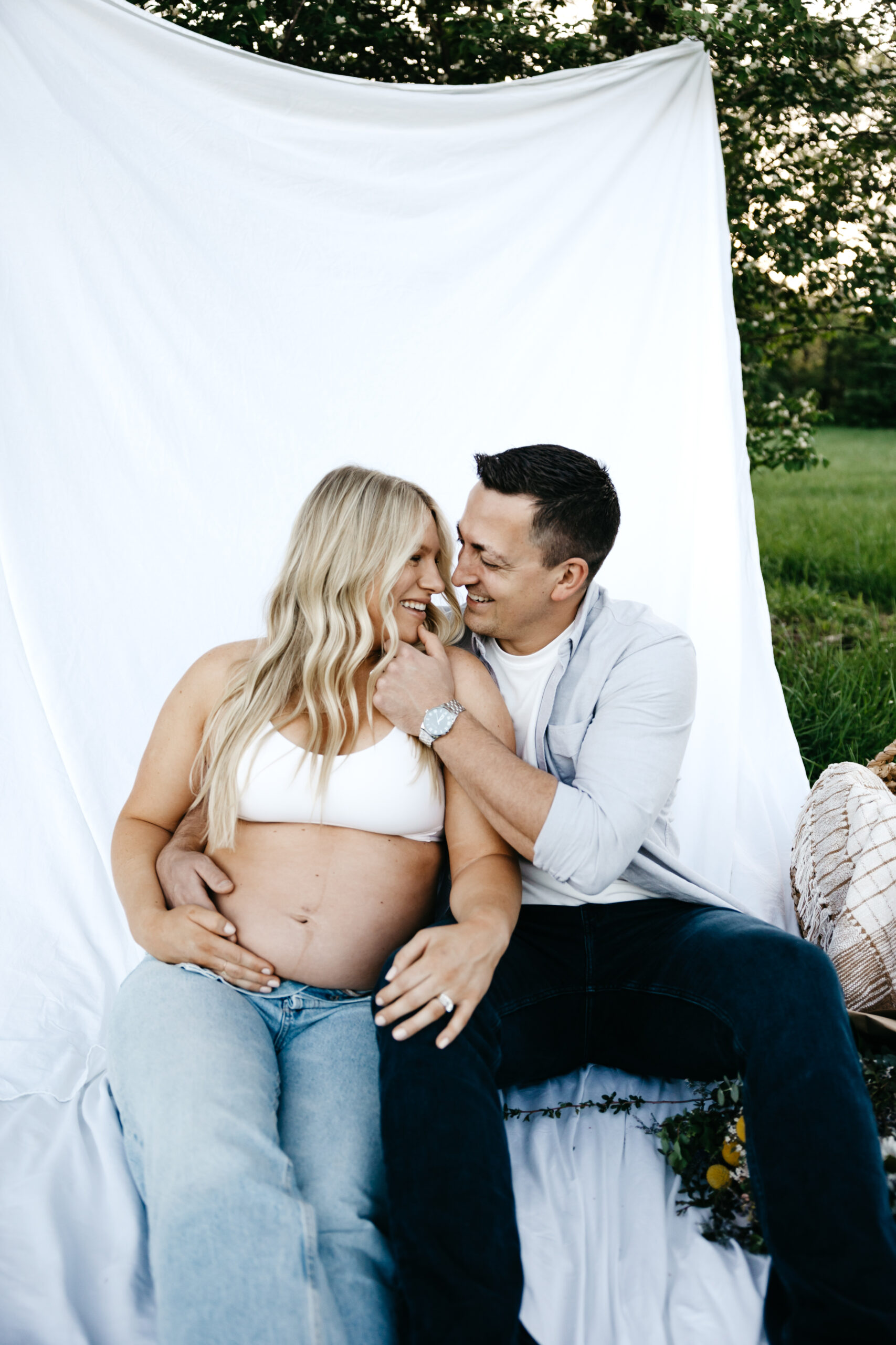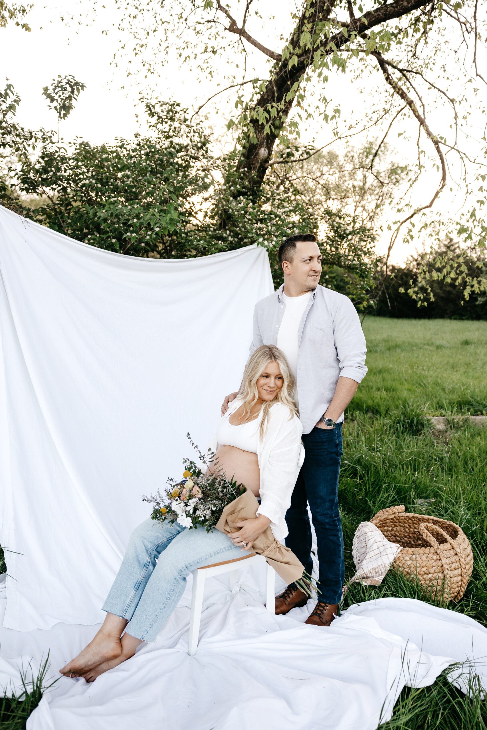 We started the shoot at Smith Park, where we found the perfect spot in the high grass to capture the beauty of nature surrounding us. We draped a white sheet over the trees and had the prettiest fresh flowers, creating a stunning backdrop for Frank and Marissa to pose in. The natural light filtering through the leaves and the soft rustling of the grass created an idyllic and serene atmosphere, perfect for capturing the magic of the moment.