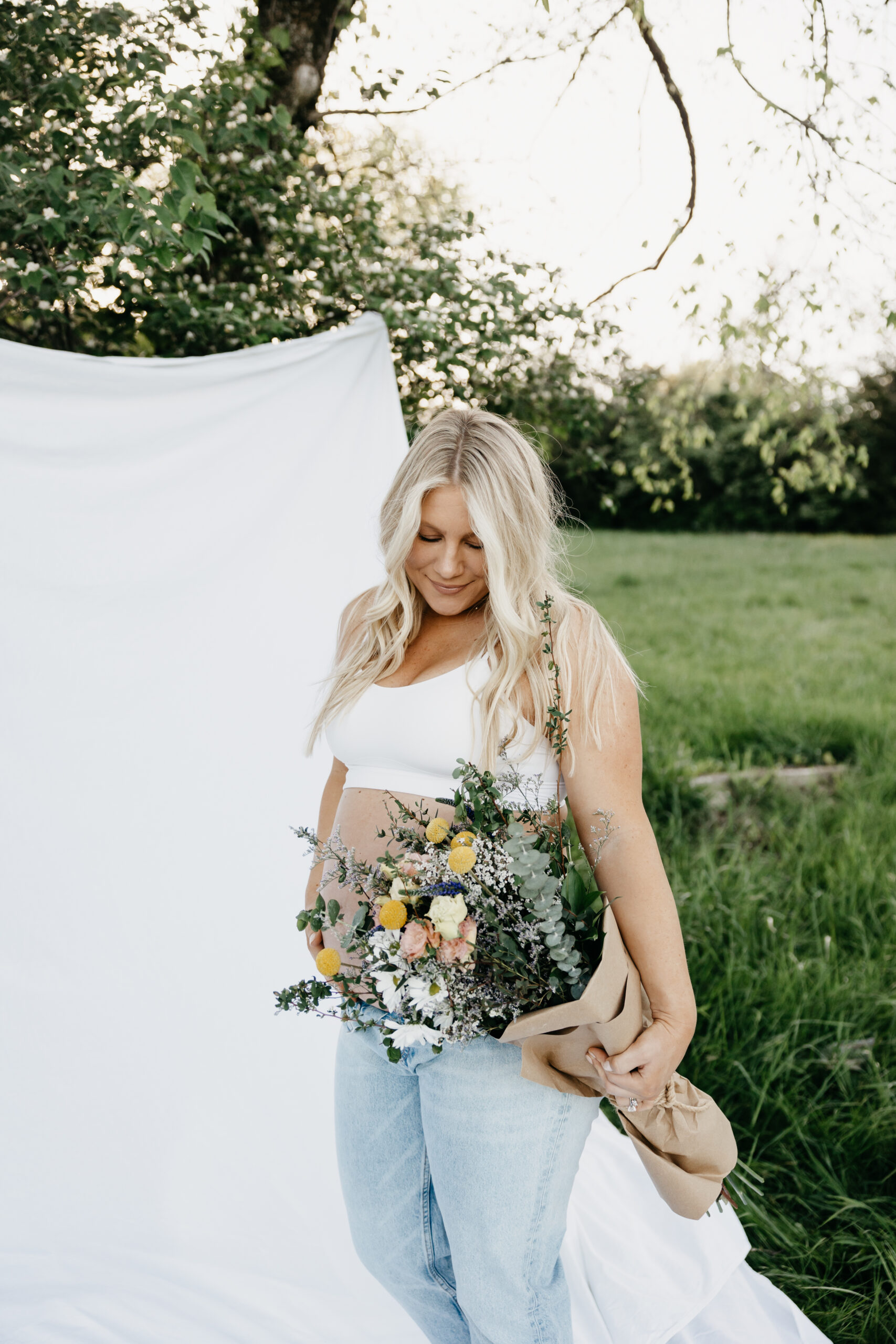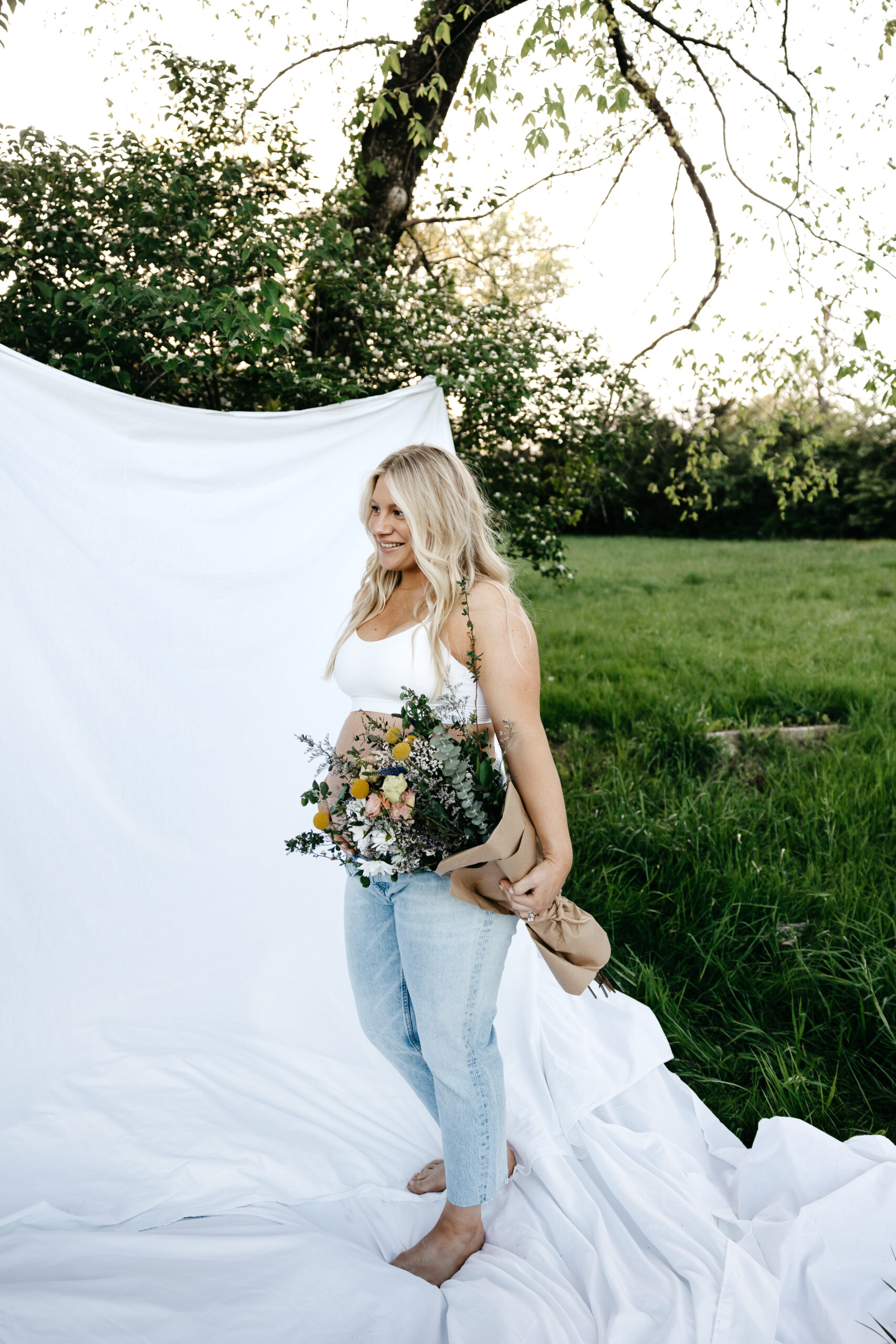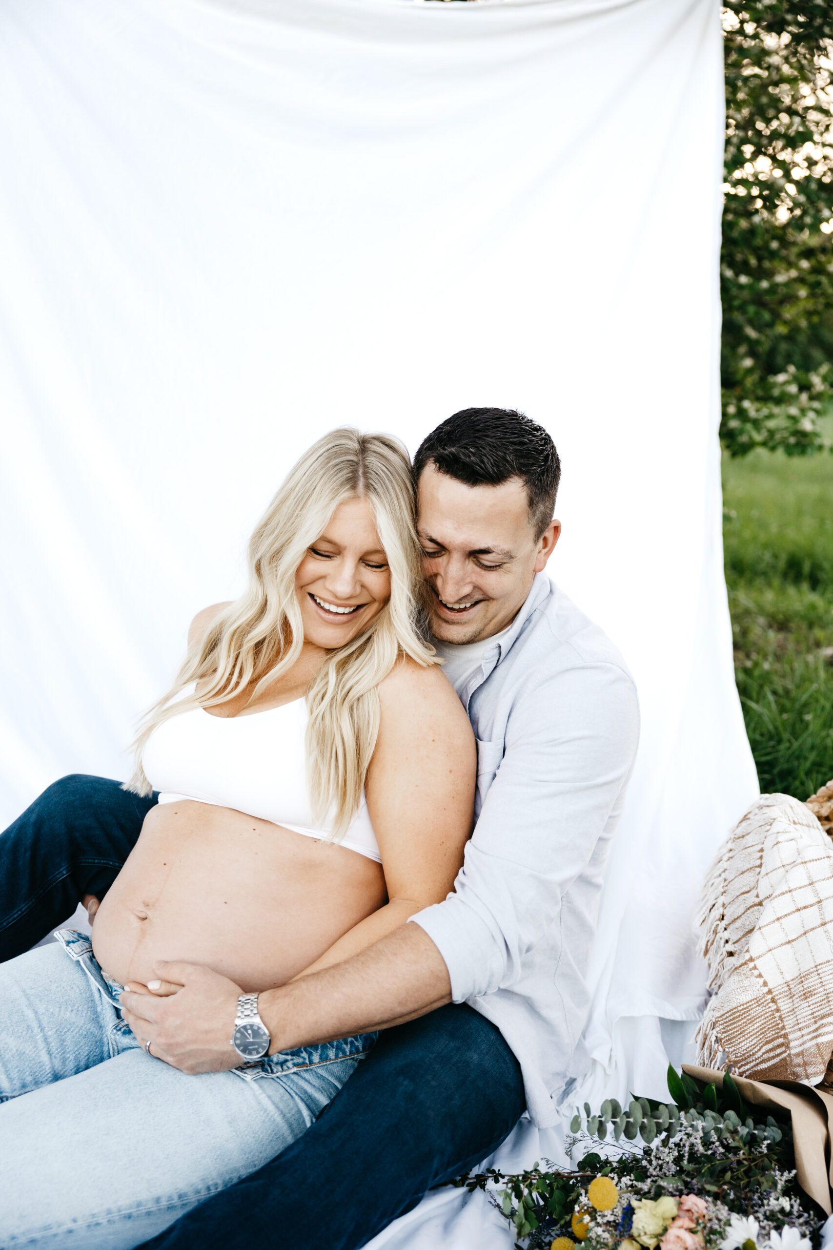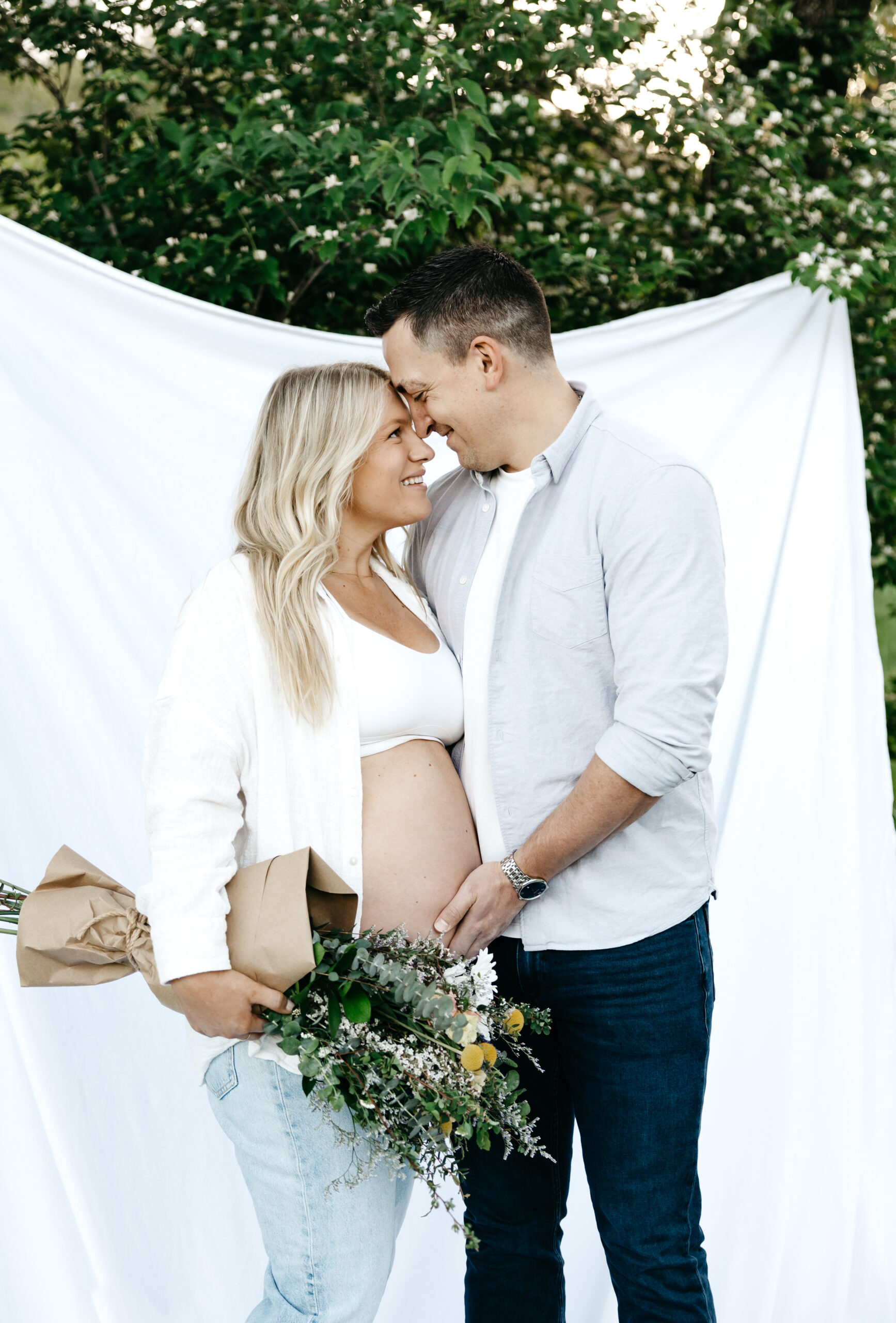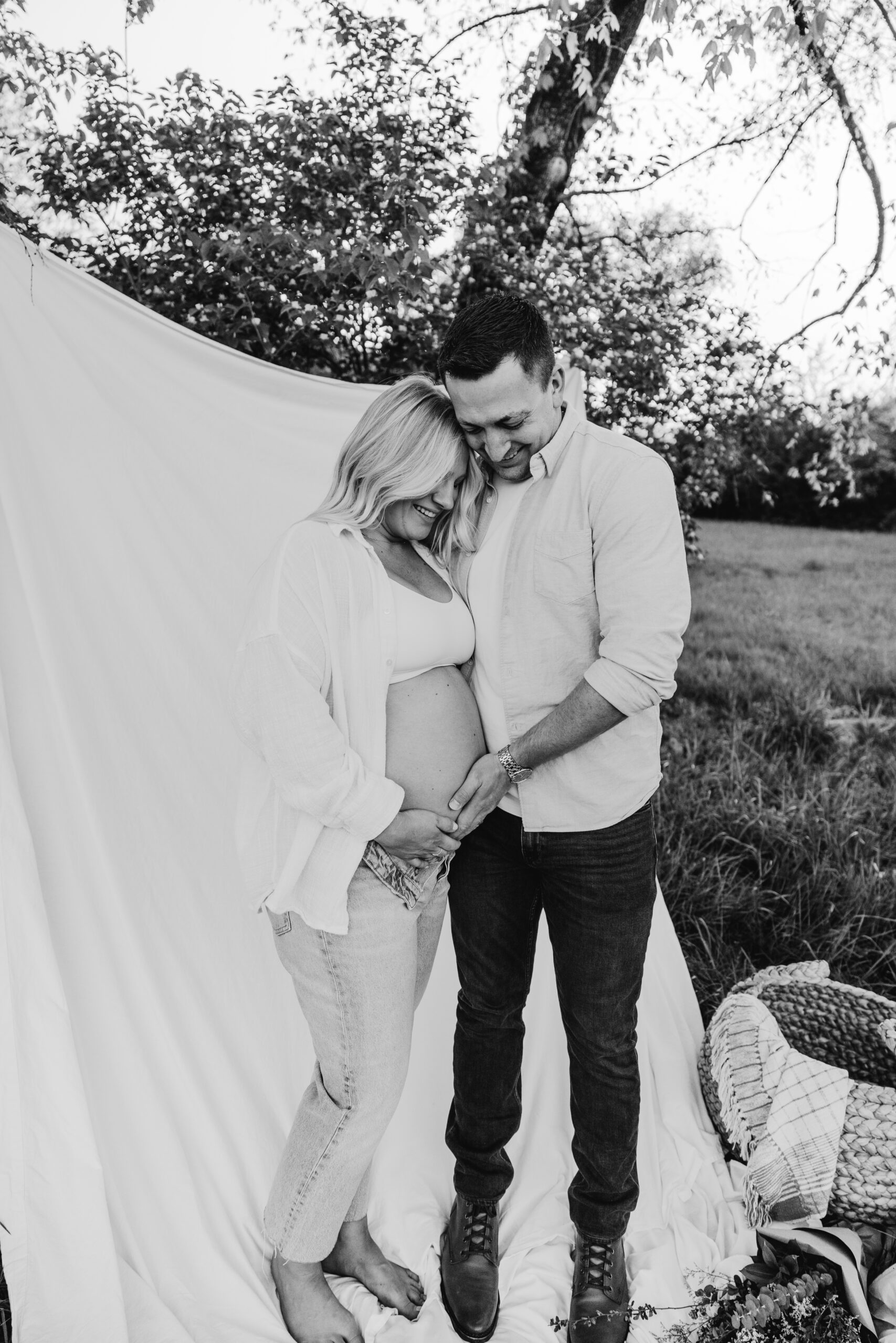 We started the shoot at Smith Park, where we found the perfect spot in the high grass to capture the beauty of nature surrounding us. We draped a white sheet over the trees and had the prettiest fresh flowers, creating a stunning backdrop for Frank and Marissa to pose in. The natural light filtering through the leaves and the soft rustling of the grass created an idyllic and serene atmosphere, perfect for capturing the magic of the moment.