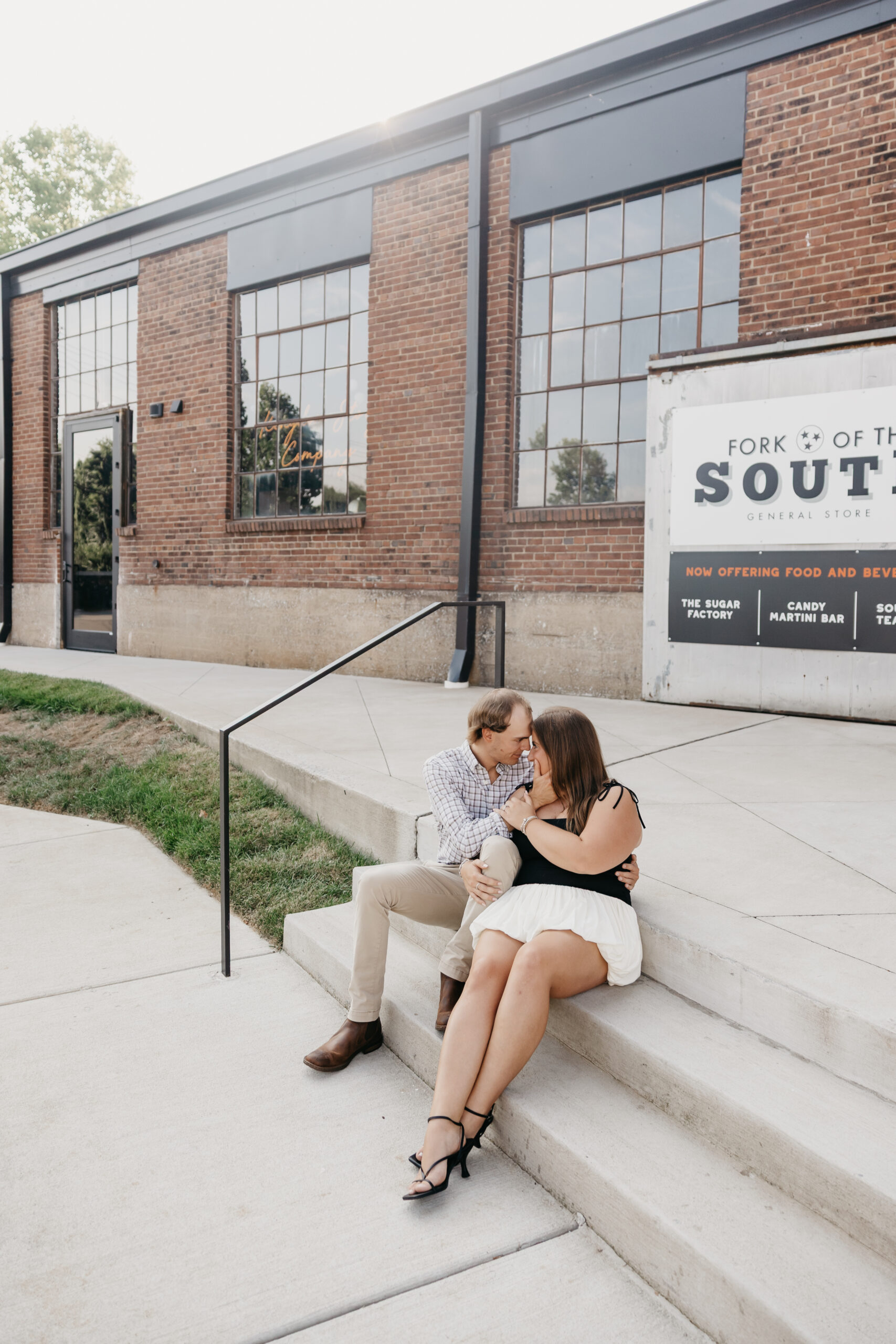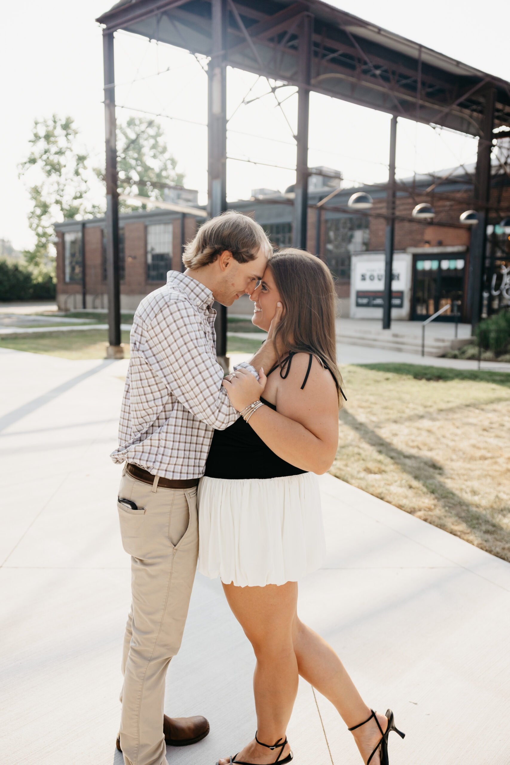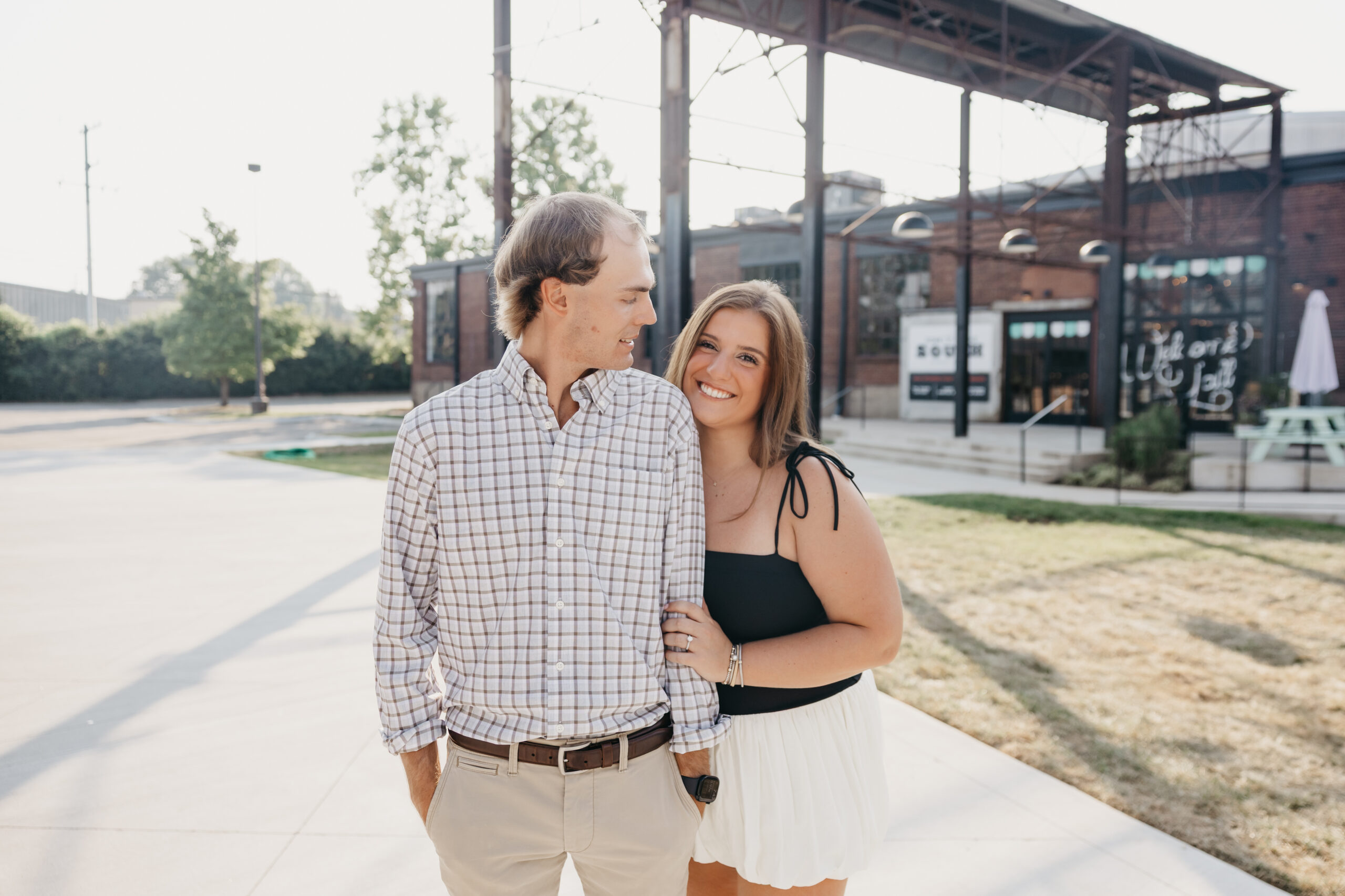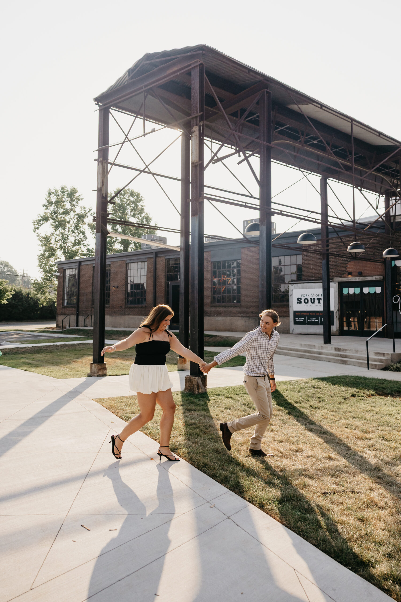 Chase and Khaki were absolute naturals in front of the camera, laughing between poses, holding hands, and soaking in that calm, just-us-two feeling before the city woke up. Afterward, we wandered over to The Factory at Franklin, where the empty walkways and industrial charm gave them even more space to just be together. No crowds, no rush — just two best friends in love.