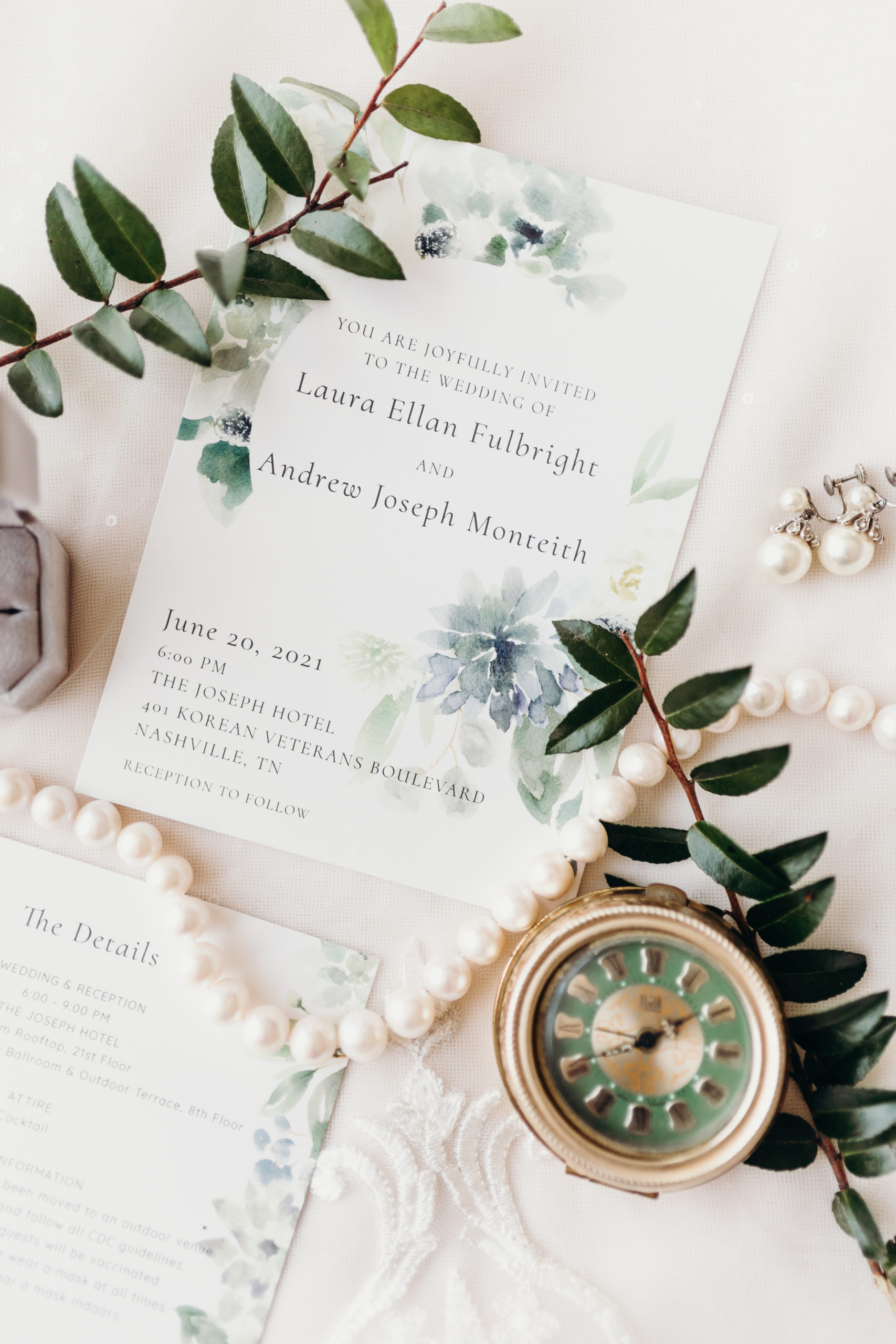 Andrew & Laura chose the most beautiful color palette with a pretty blues. This gave such a stunning look, that looked perfectly intentional yet totally effortless. The organic floral design was one of the highlights of the day, featuring lots of greenery. Altogether, the details were visually captivating. But none as much as Laura’s glam bridal look, which featured the most stunning gown. She had all the vintage jewelry, including her grandmothers earrings & Andrews grandfathers pocket watches!