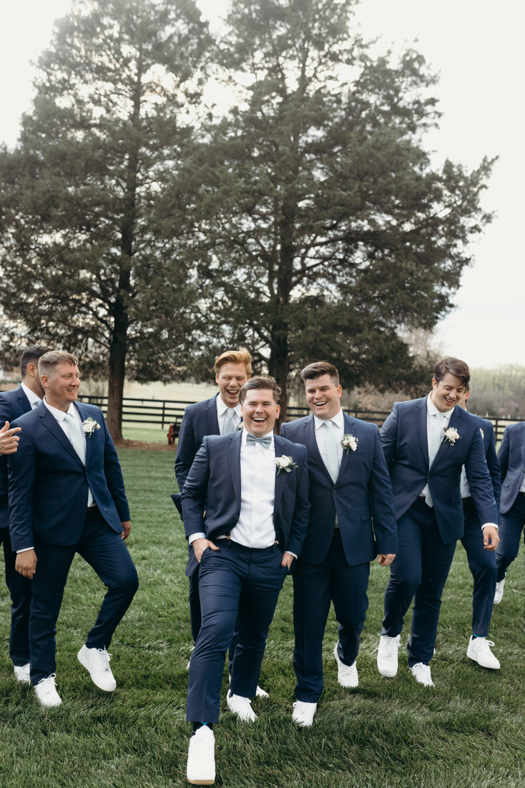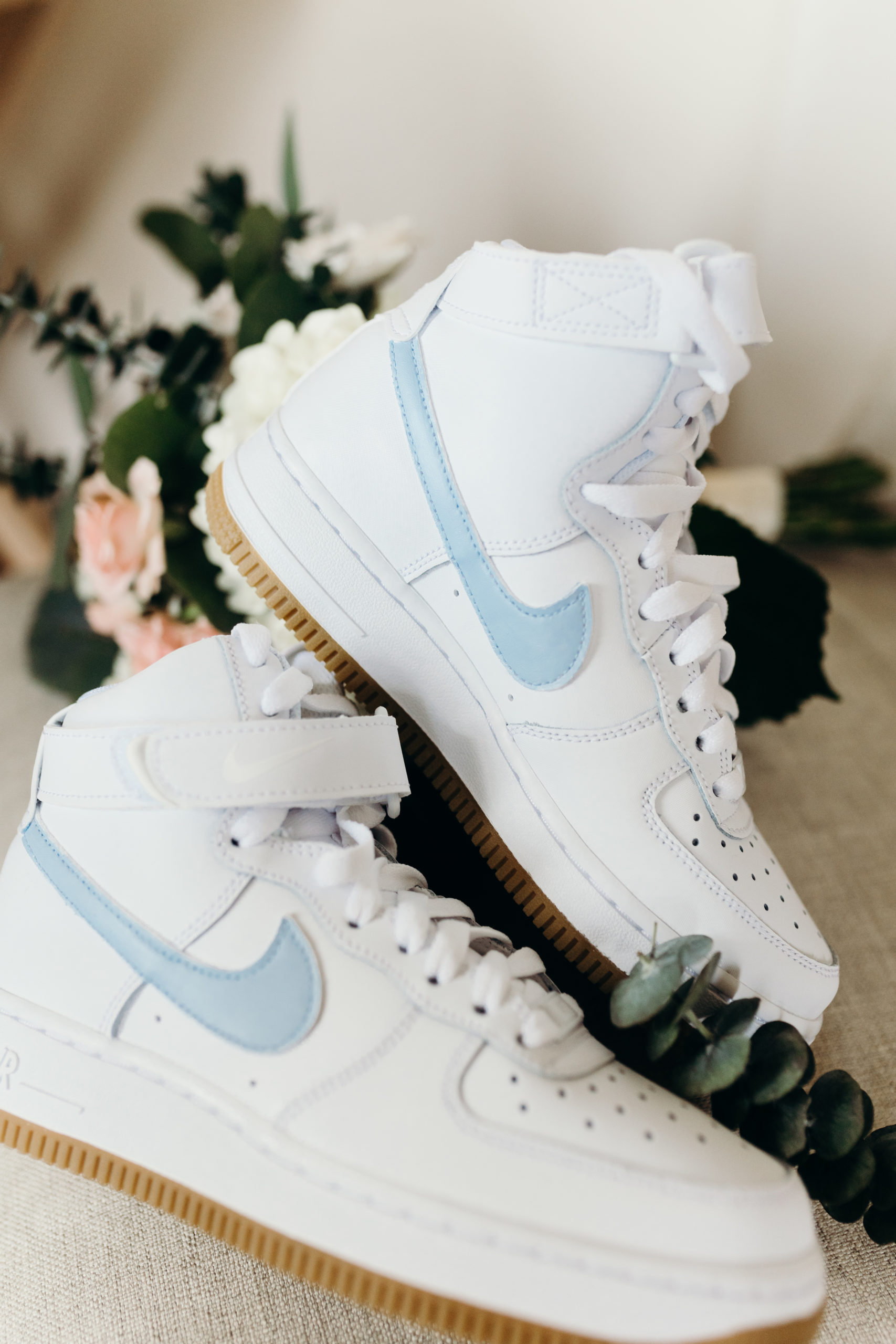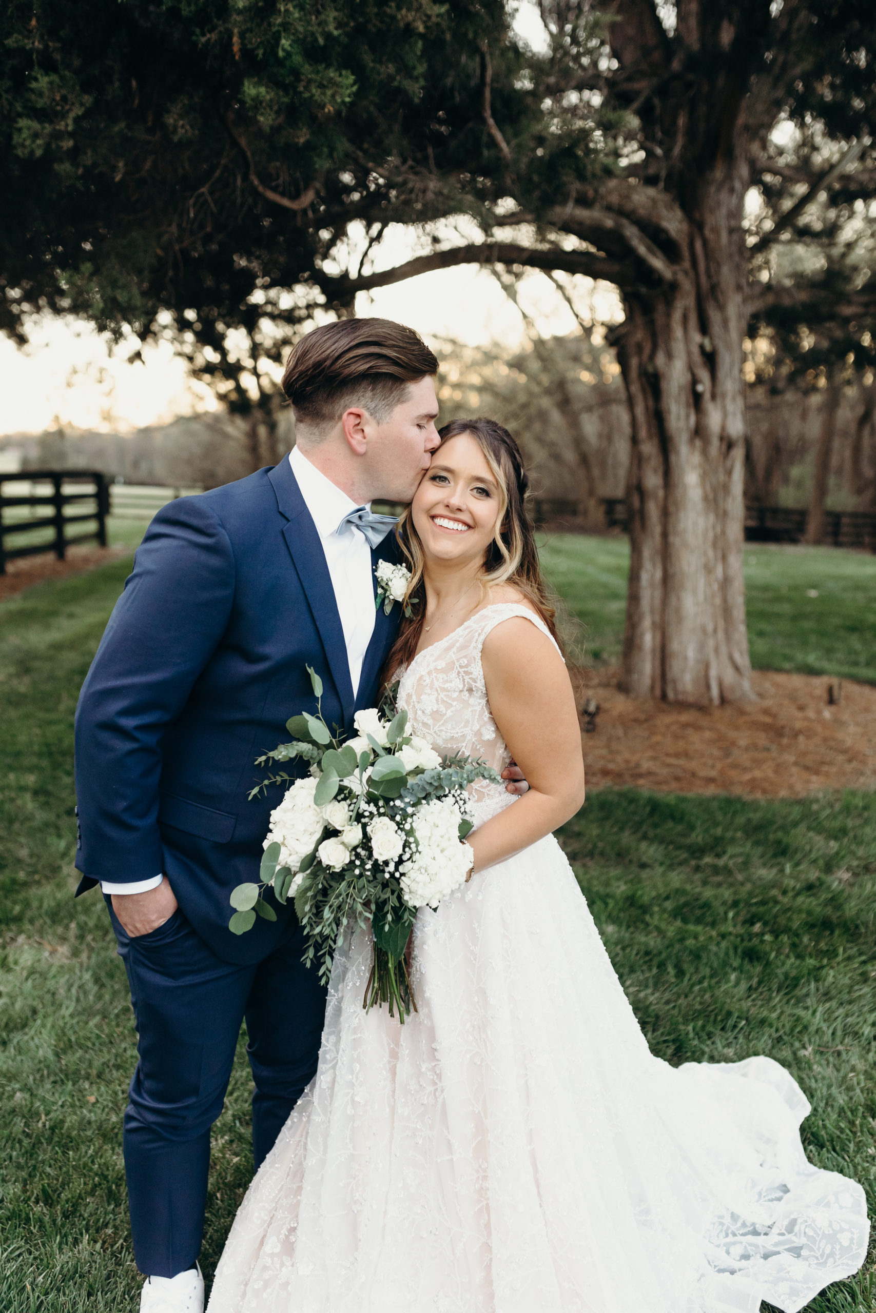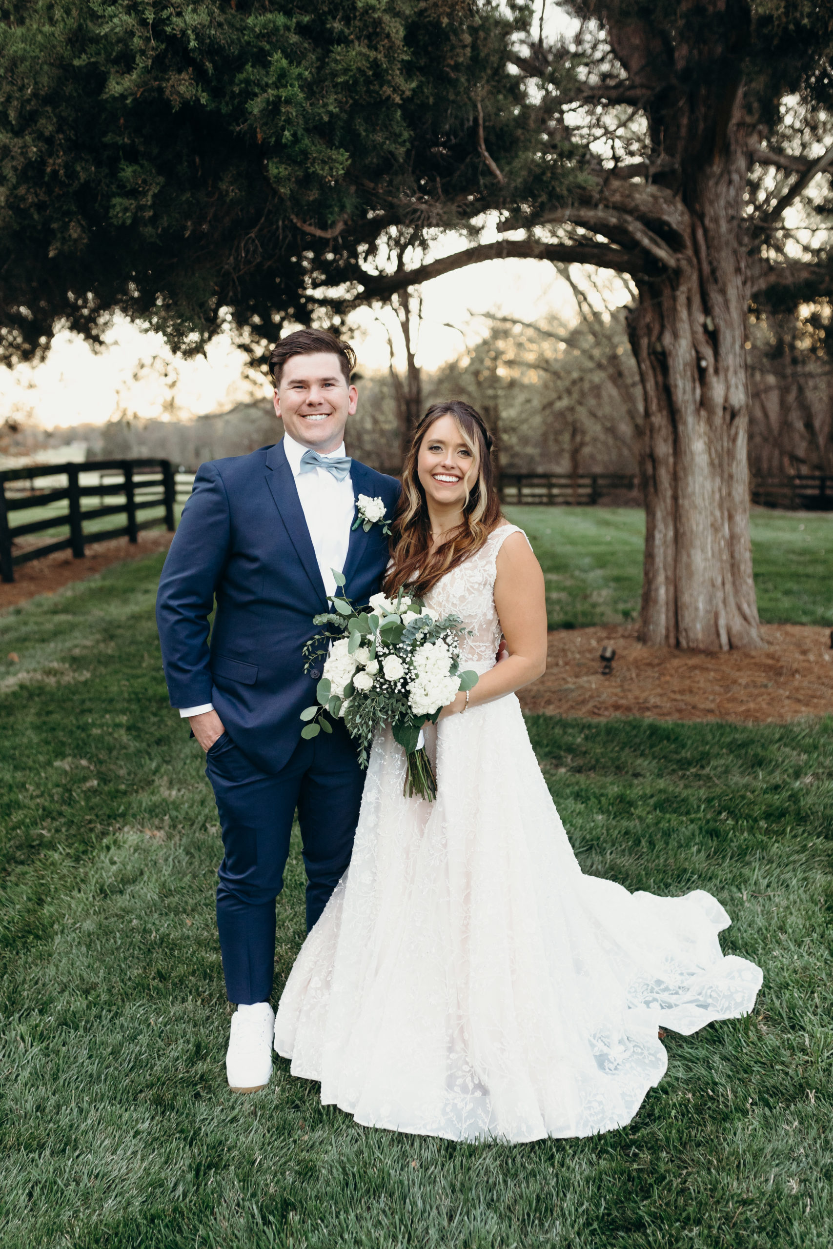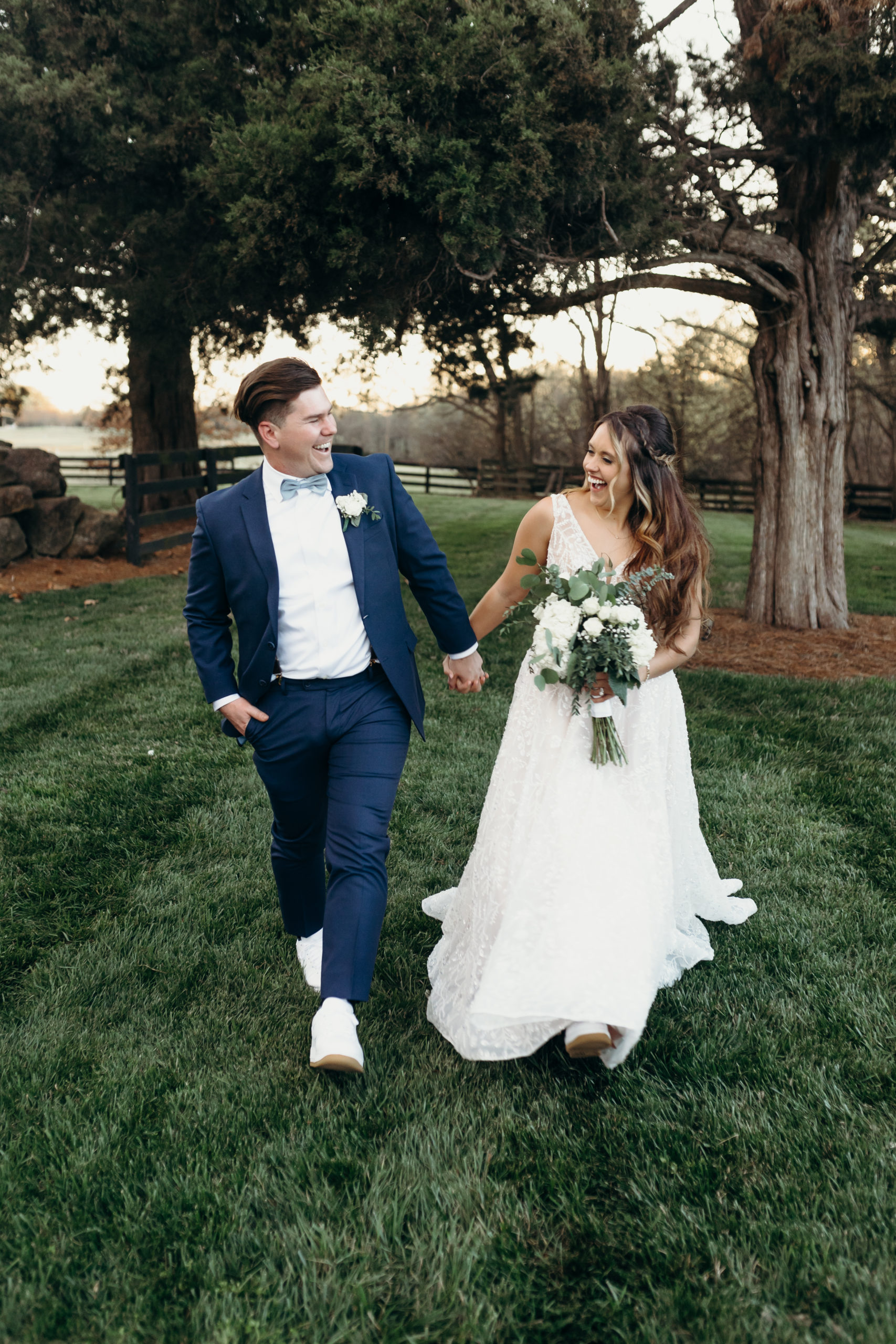 Danny & Sammi Jo chose a classic natural color palette with blues & navy. This evoked such elegance that looked perfectly intentional yet totally effortless. The organic floral design was one of the highlights of the day, featuring lots of lush greenery. Altogether, the details were visually captivating, but none so much as Sammi’s glam bridal look, which featured the most stunning gown & the cutest Air Force 1’s.